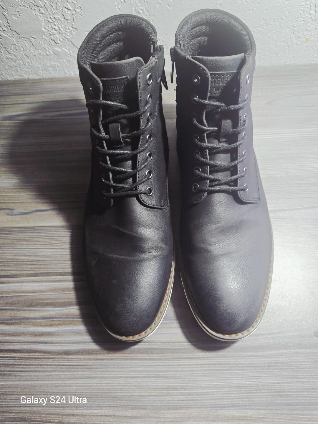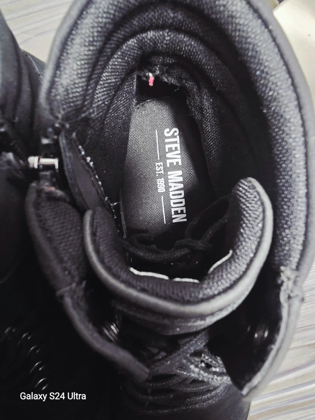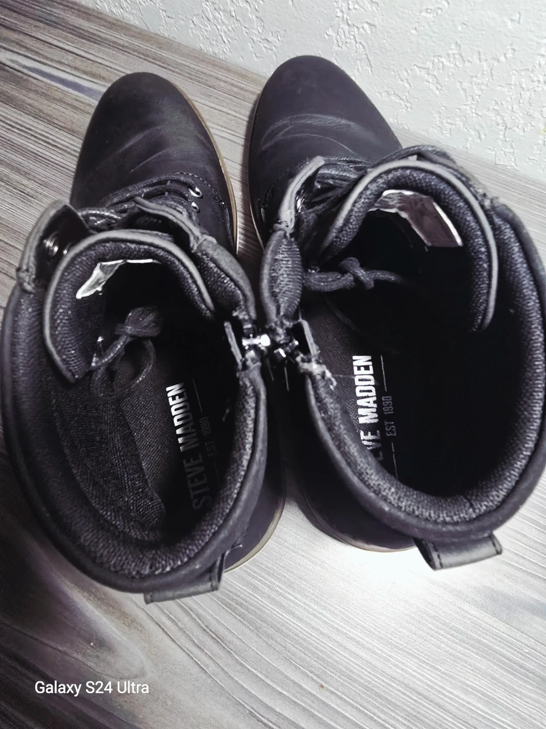 Like new, only been worn a couple times. These are black Steve Madden lace-up boots. They feature a side zipper for easy wear. Leather material. Size 11 Men's.