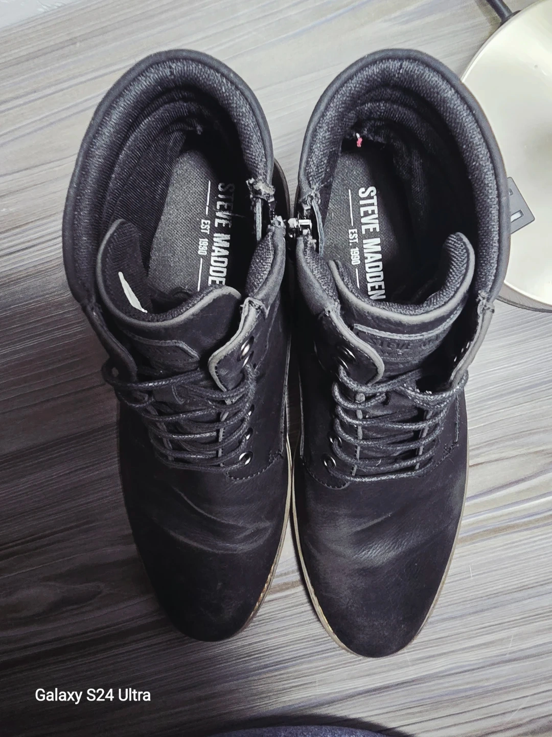 Like new, only been worn a couple times. These are black Steve Madden lace-up boots. They feature a side zipper for easy wear. Leather material. Size 11 Men's.