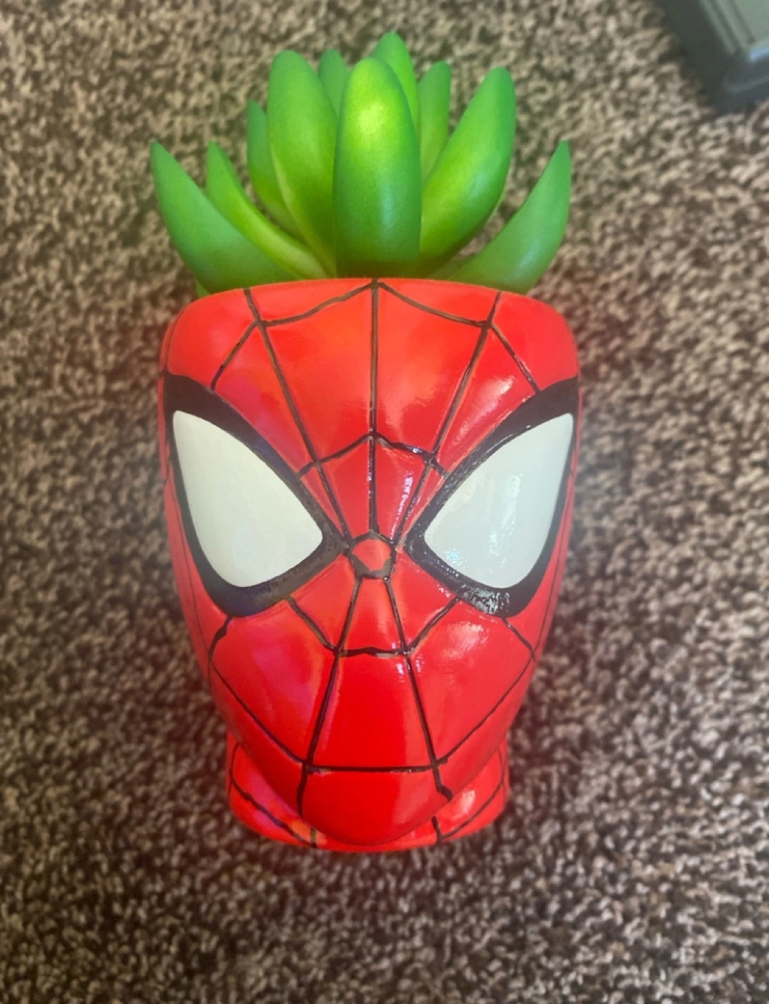 Ceramic planter featuring Spider-Man's face. Includes a small artificial succulent plant.