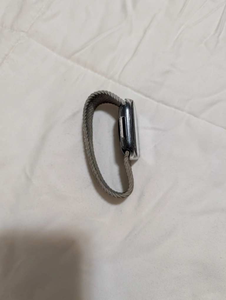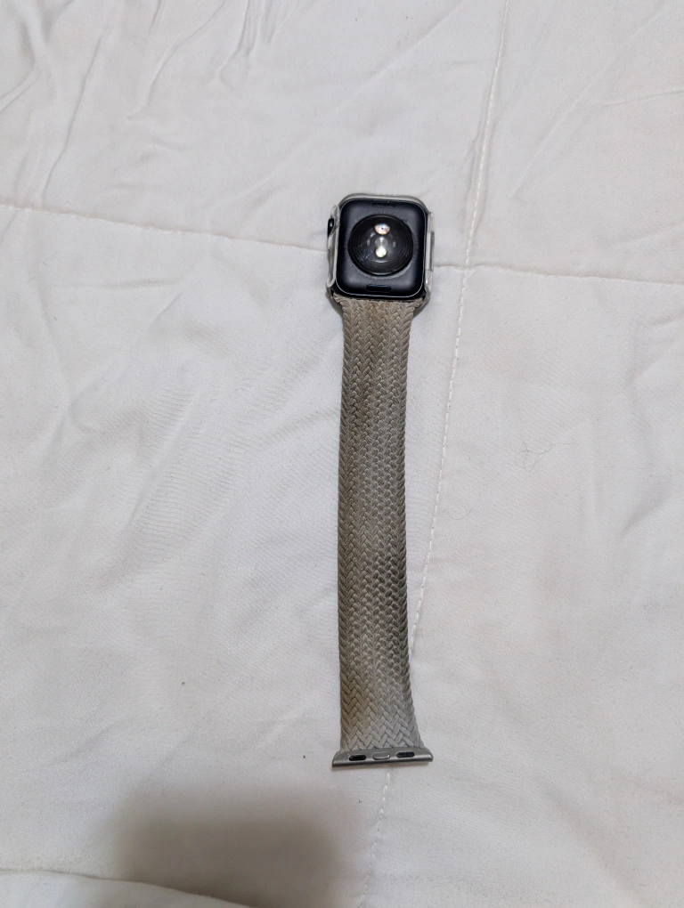 Apple Watch Series 4 with a clear case and a braided solo loop band. The watch is in good condition with minimal wear. It comes with a charging cable.