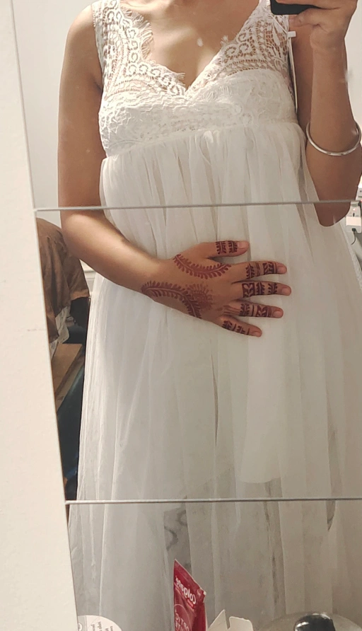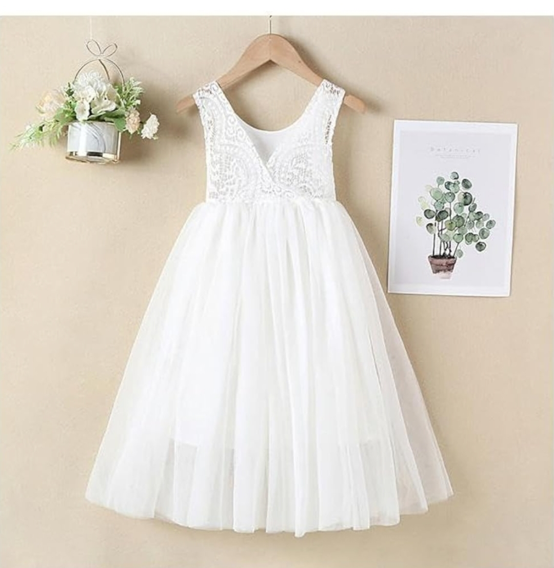 White sleeveless dress with lace detailing on the back and bodice. Tulle skirt with a flowy silhouette.