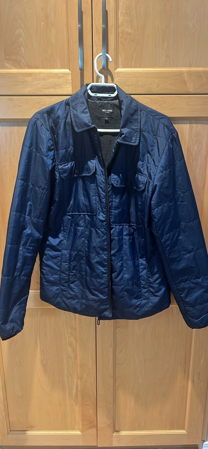 Men's blue puffer jacket. Long sleeves, zip closure, two pockets.