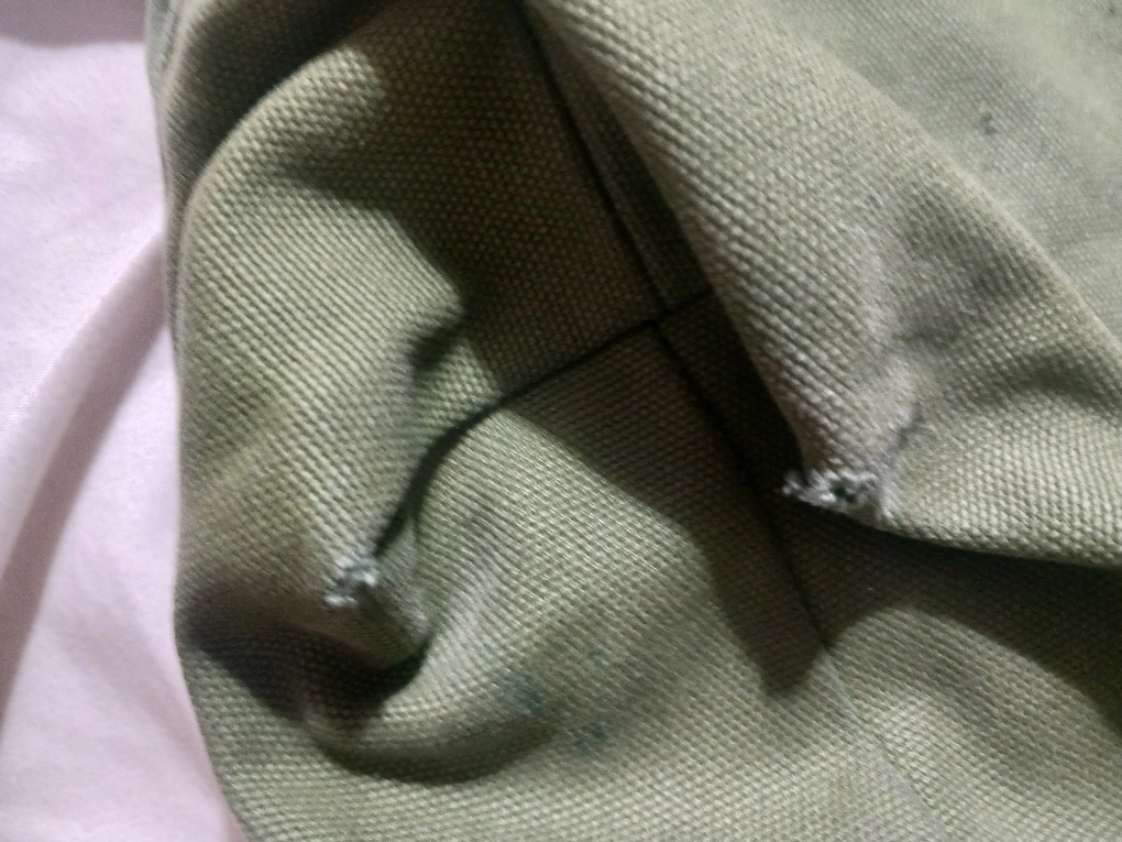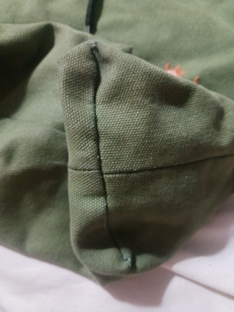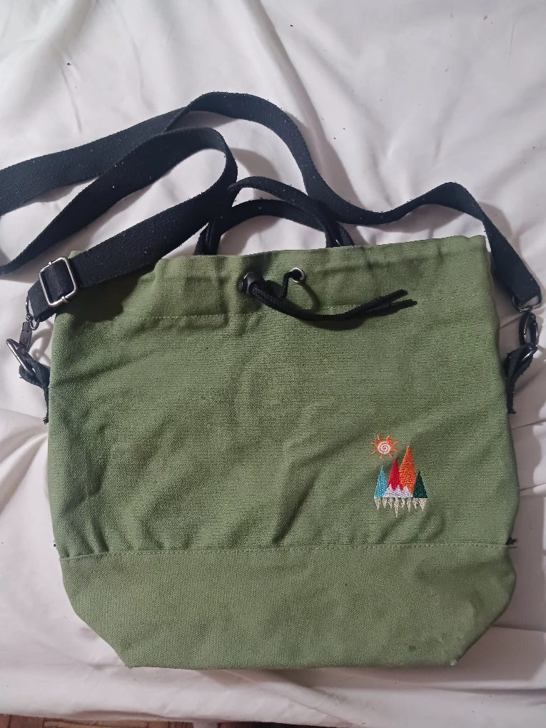 freecycle. Green canvas drawstring bag with a small embroidered design. Adjustable shoulder strap. Small tear on corner of bad. I enjoyed this bag alot and now willing to let someone else enjoy it. it's light weight and good size