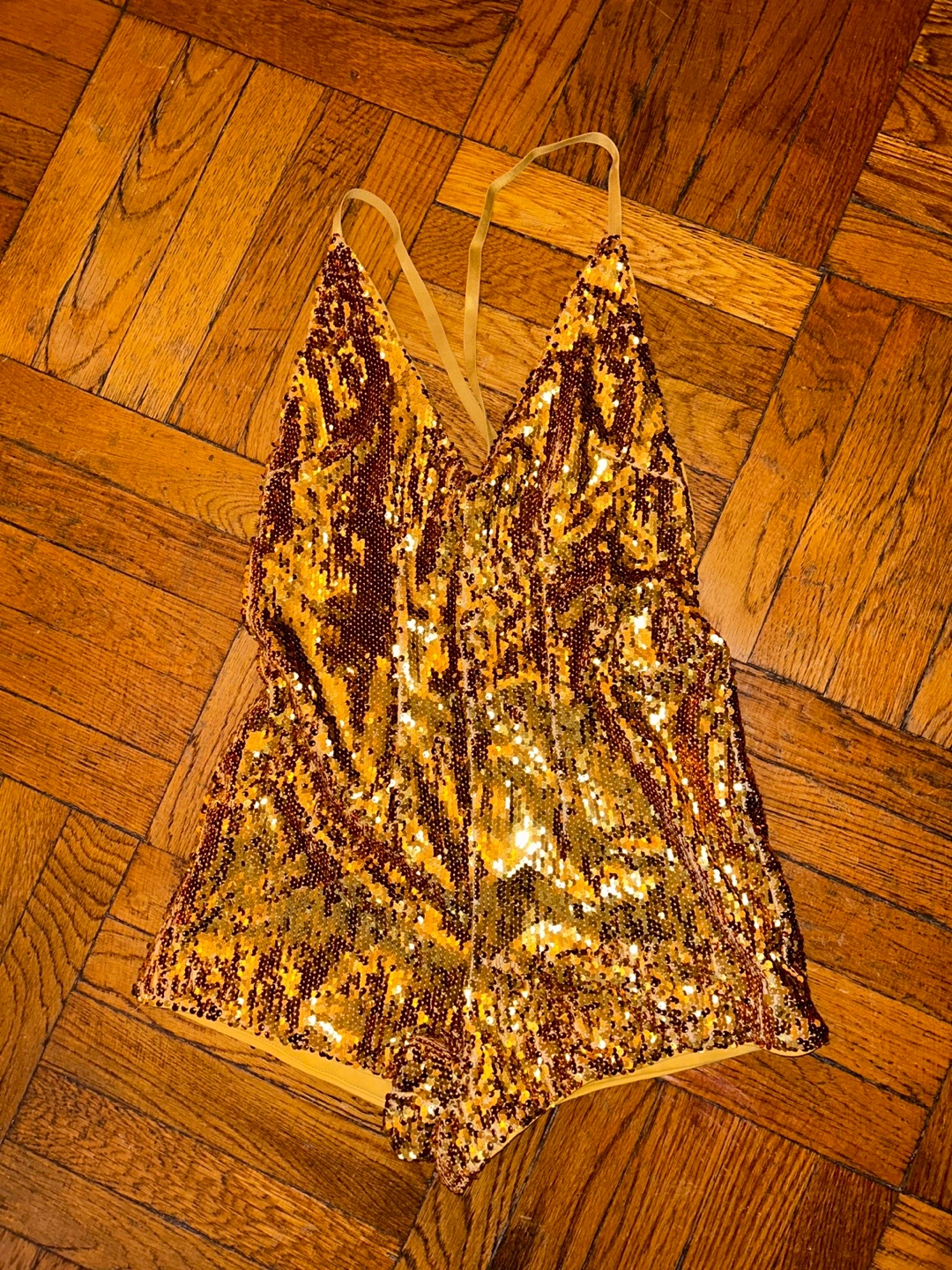 Forever 21 Gold sequin jumpsuit with a V-neck and adjustable straps. Perfect for a night out or a party. Size large but fits more like a medium. Pickup on the Upper West Side