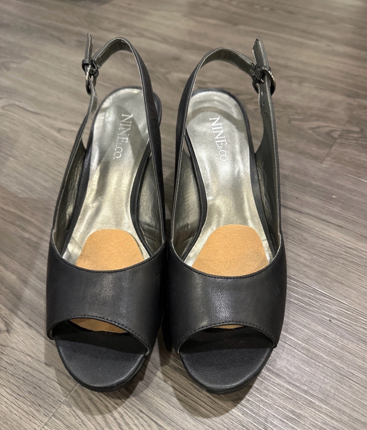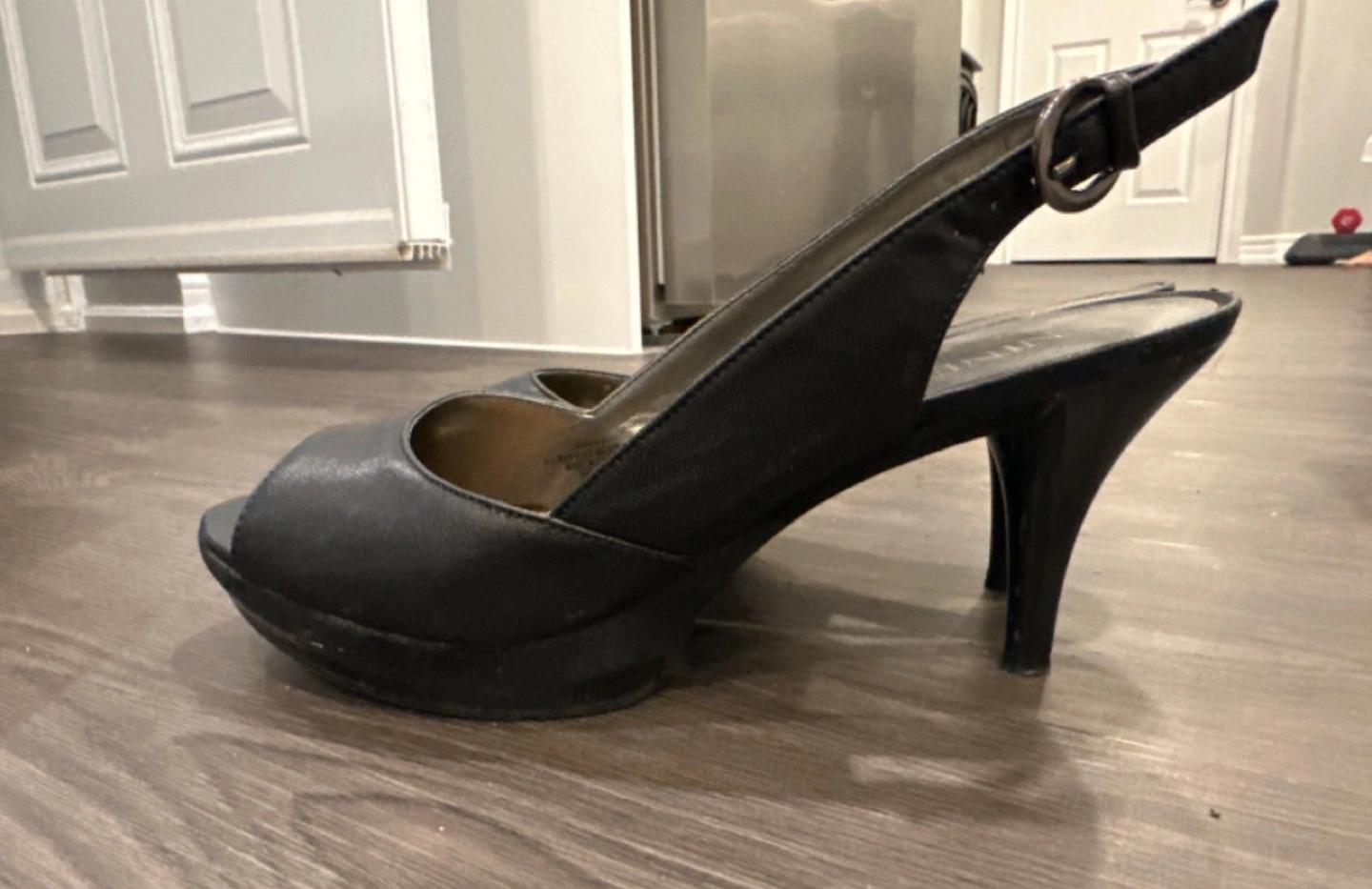 Black leather platform heels with an ankle strap and buckle. Open toe style. Slight wear and tear on the leather.