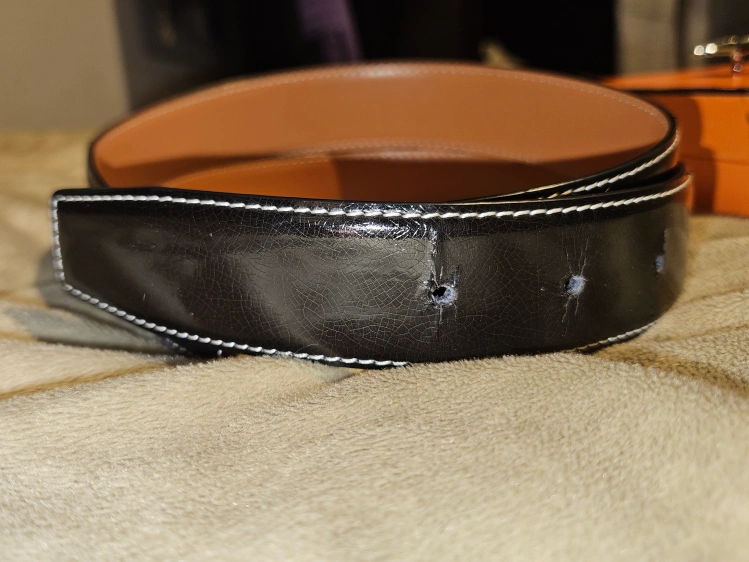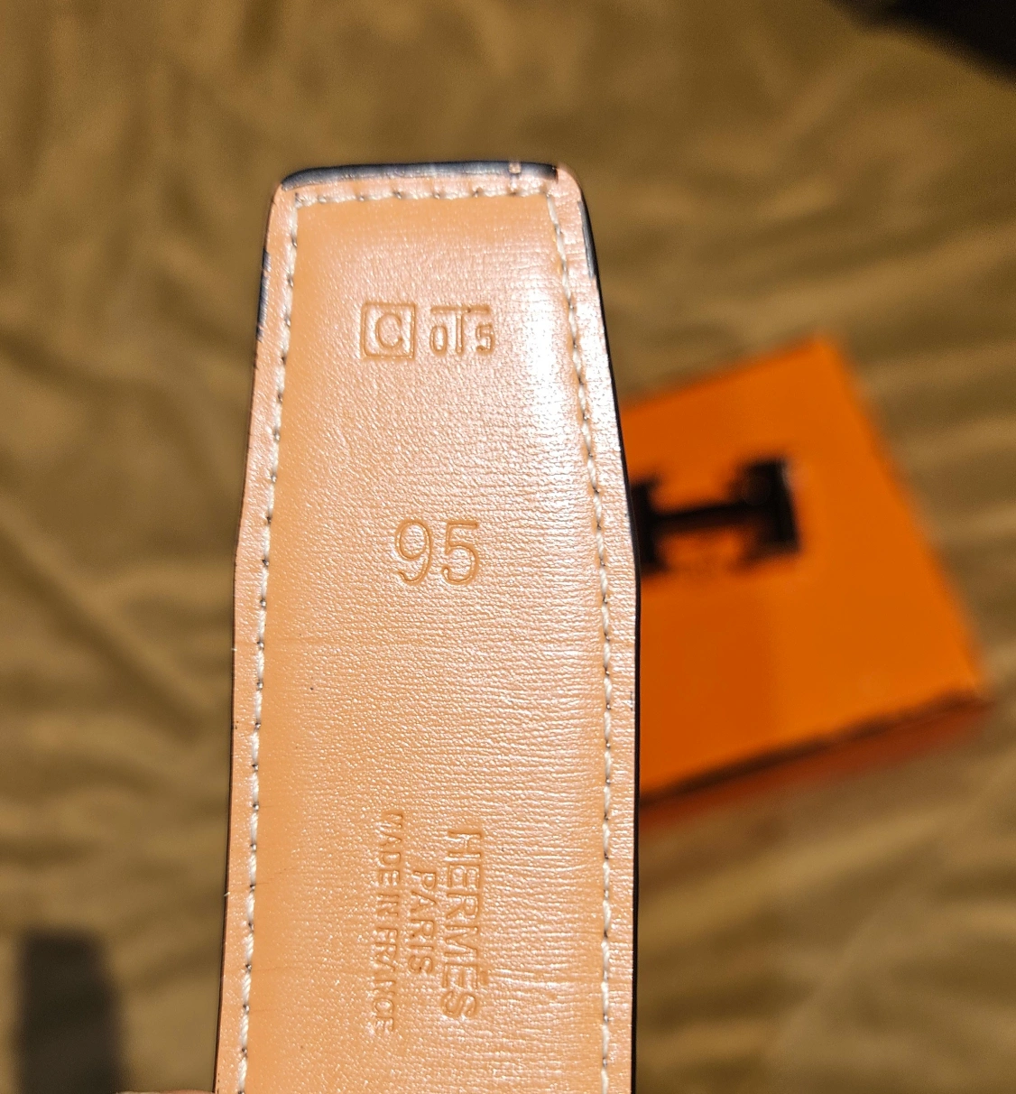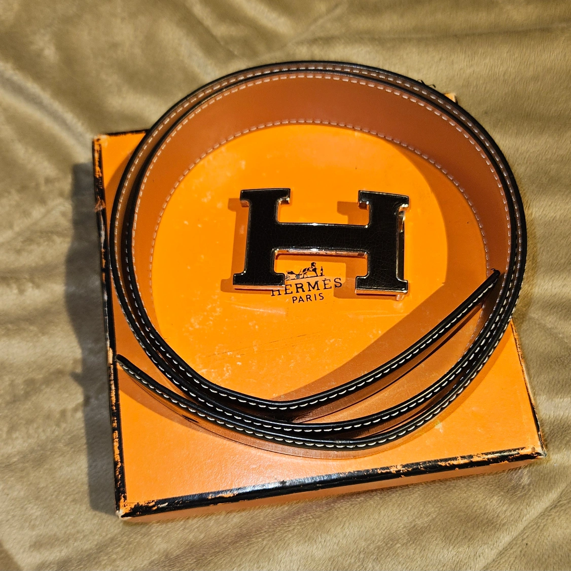Black/tan leather reversible belt with black H buckle. Comes with box. 8/10 condition