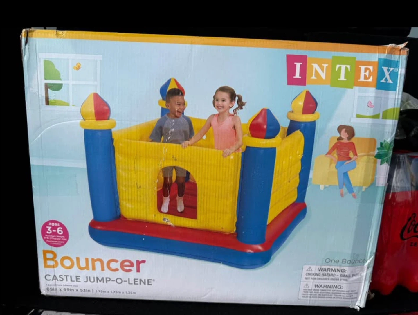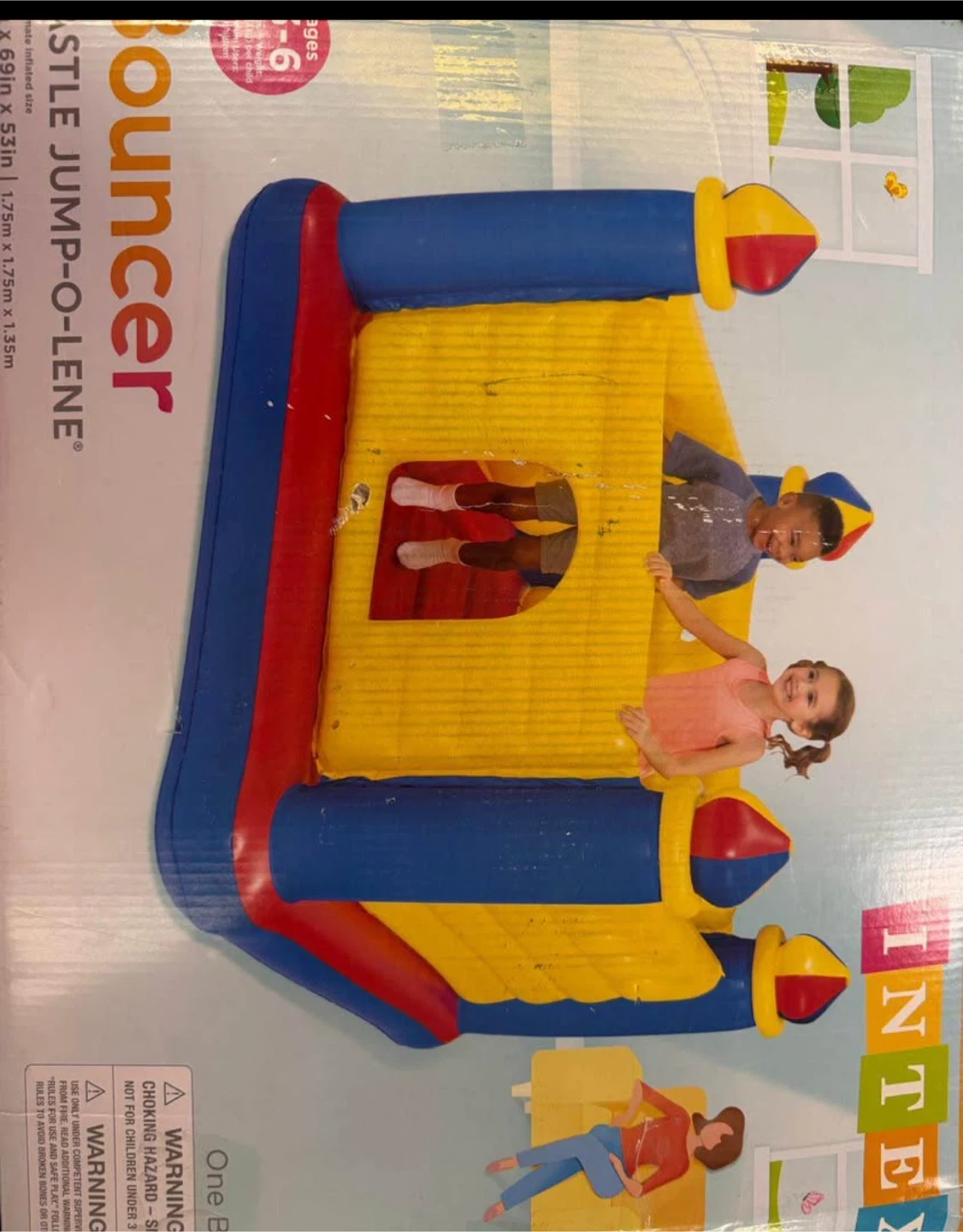 Intex Jump-O-Lene Castle Bouncer for ages 3-6. It measures 69" x 53" x 53". This inflatable castle is a fun way for kids to play indoors or outdoors!