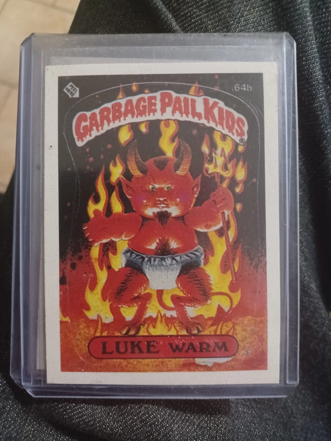 This is a Garbage Pail Kids trading card featuring the character "Luke Warm". It's card number 64b. This collectible is in a protective sleeve.