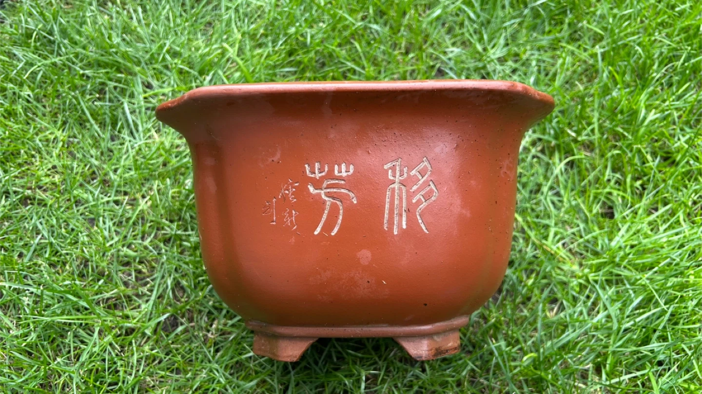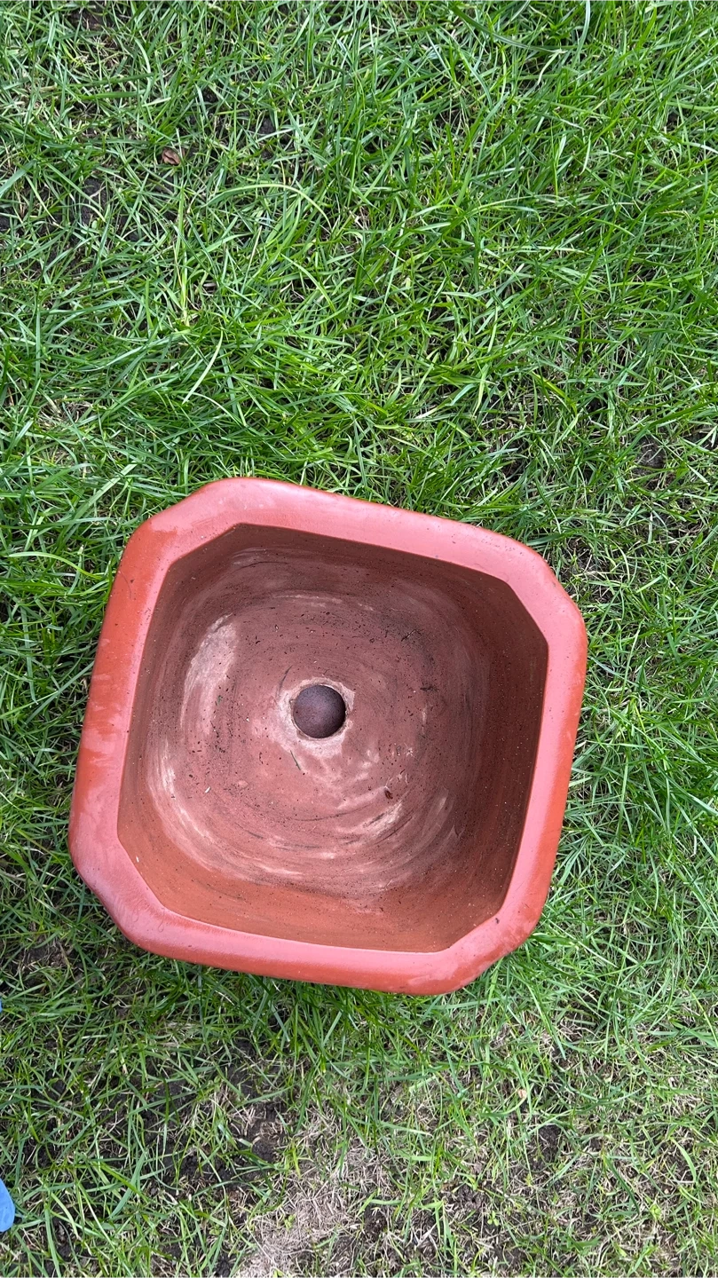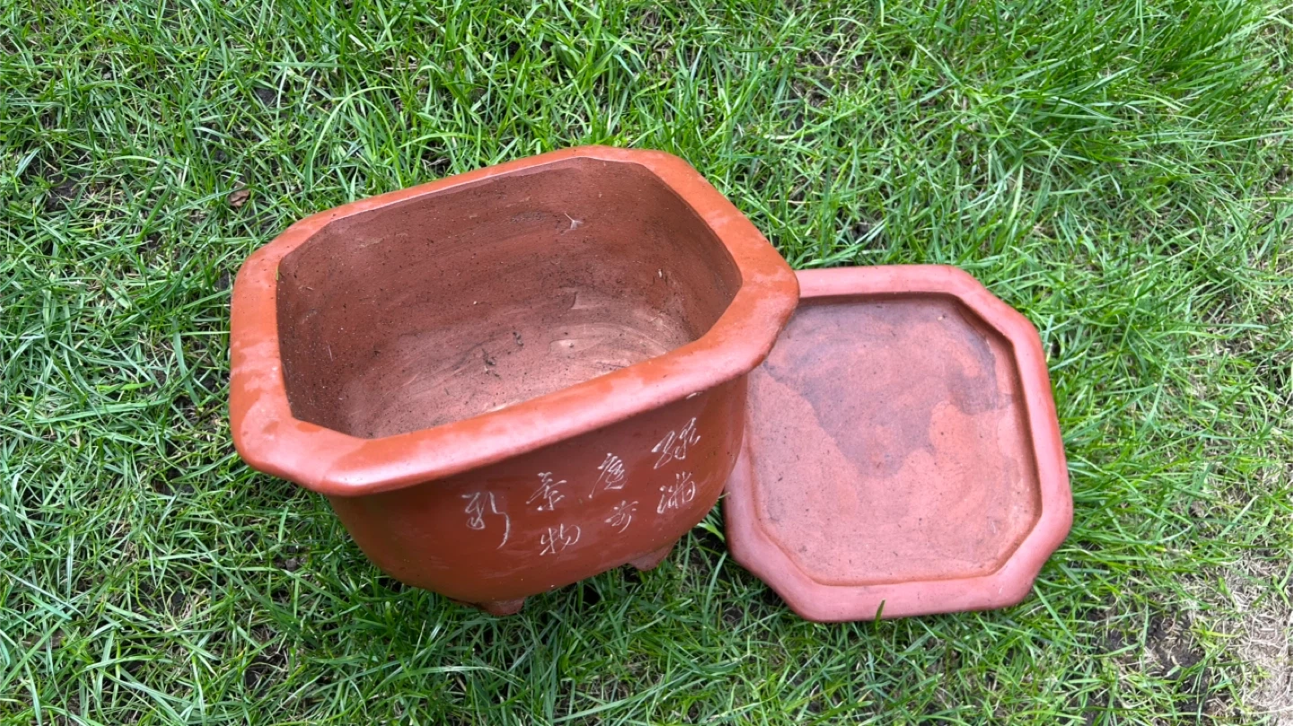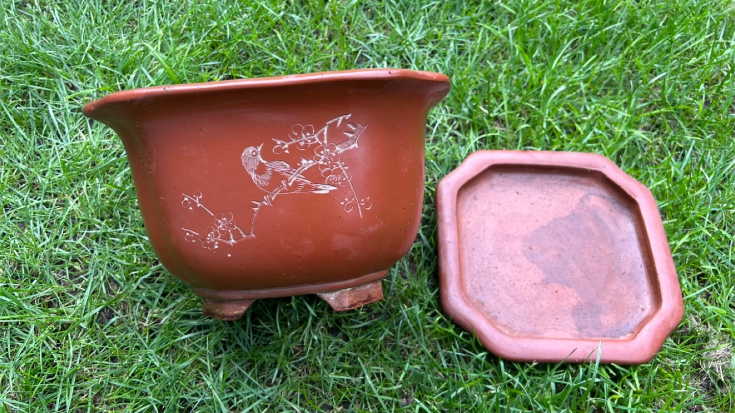 This is a classic terracotta plant pot, featuring decorative etchings of bamboo and a bird. It comes with a matching octagonal saucer. Its size makes it suitable for a variety of small plants or bonsais. The pot has a drainage hole in the bottom.