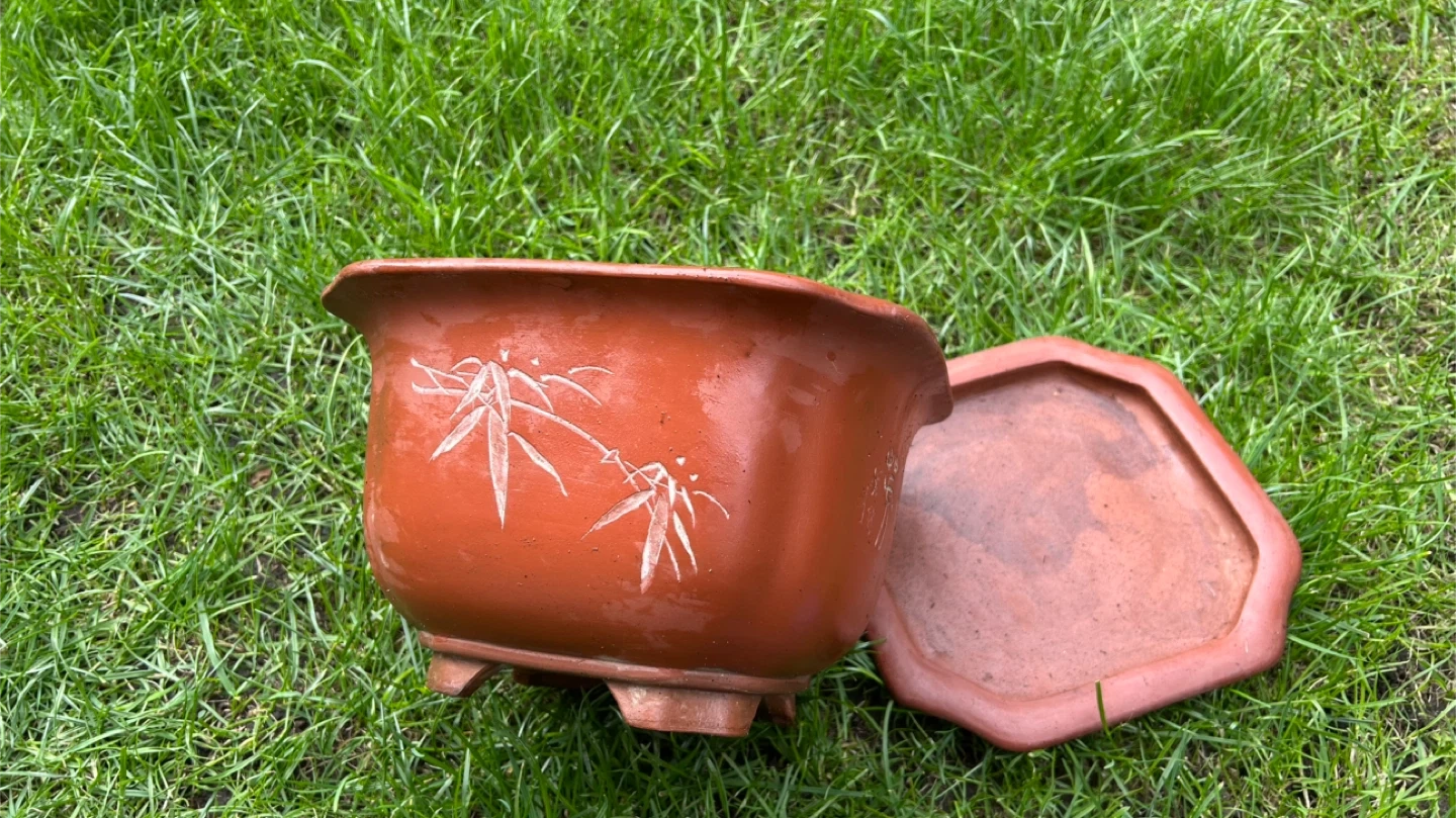 This is a classic terracotta plant pot, featuring decorative etchings of bamboo and a bird. It comes with a matching octagonal saucer. Its size makes it suitable for a variety of small plants or bonsais. The pot has a drainage hole in the bottom.