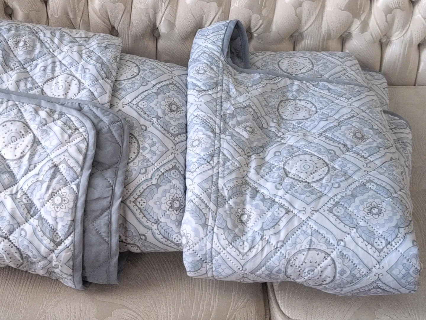This quilted sofa covers set features a beautiful blue and white medallion pattern. It's made of a soft cotton blend, perfect for adding a touch of style to your sofa