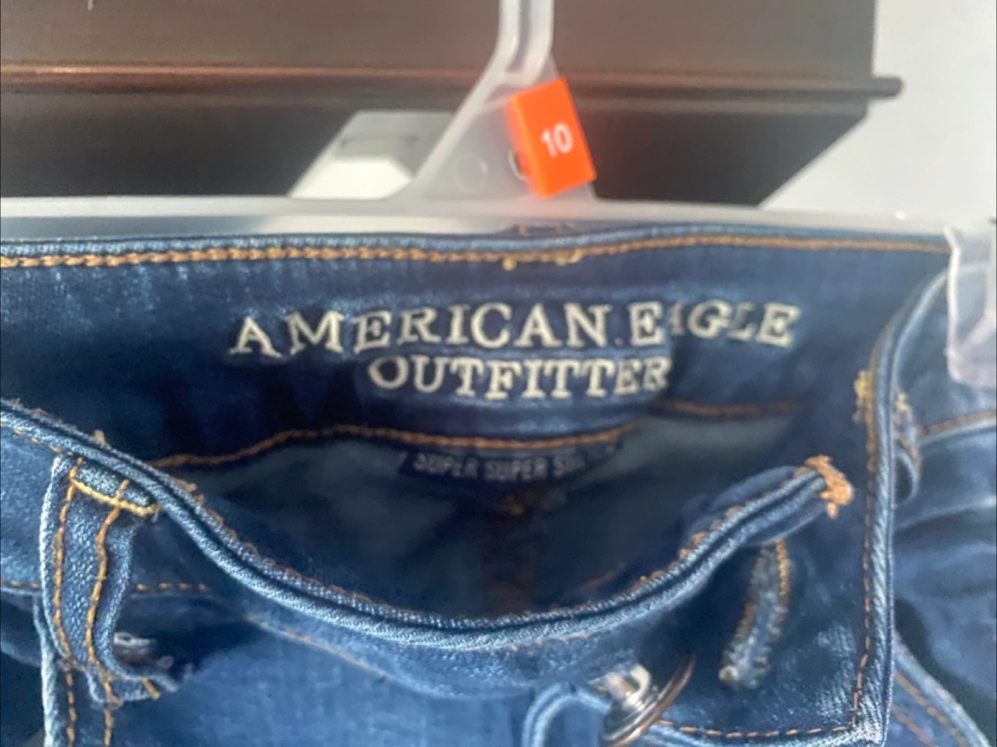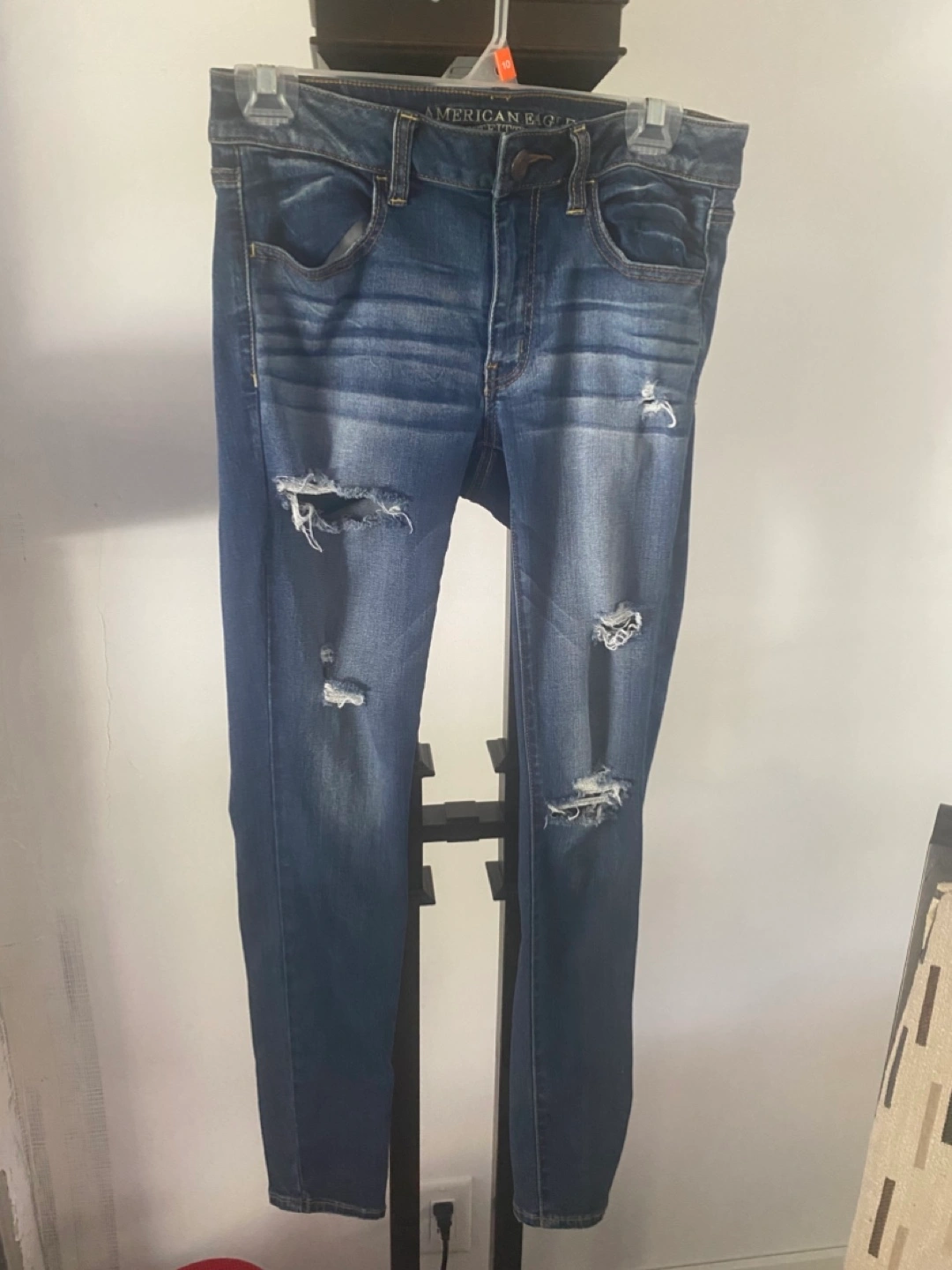 Selling a pair of American Eagle jeans in size 6They have a super super stretch. They're in good condition, with some stylish distressed details.