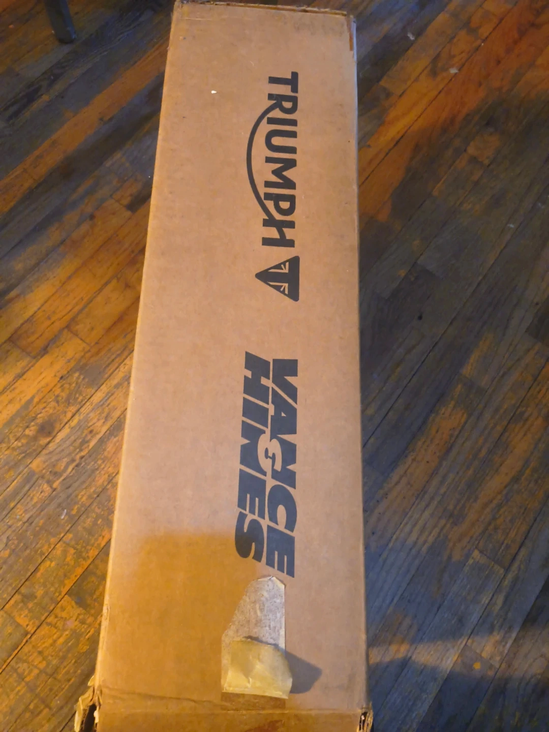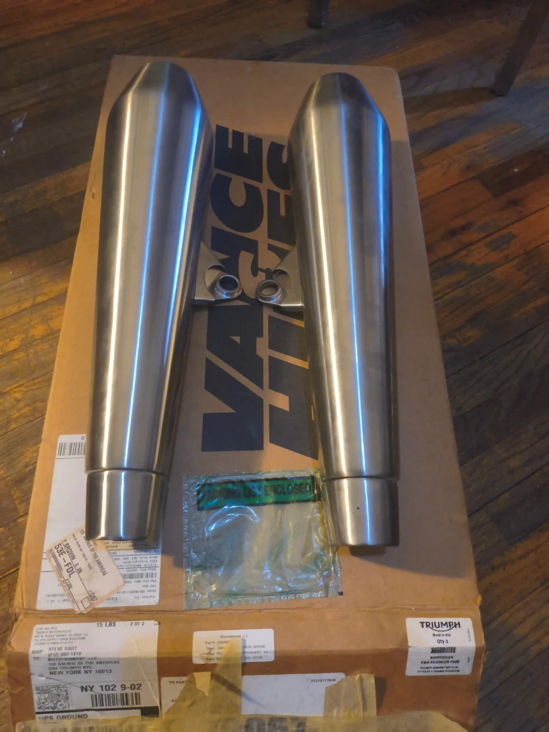 Set of Vance & Hines mufflers for a motorcycle. Stainless steel construction. Includes mounting hardware and is in original packaging. Designed for Triumph motorcycles.