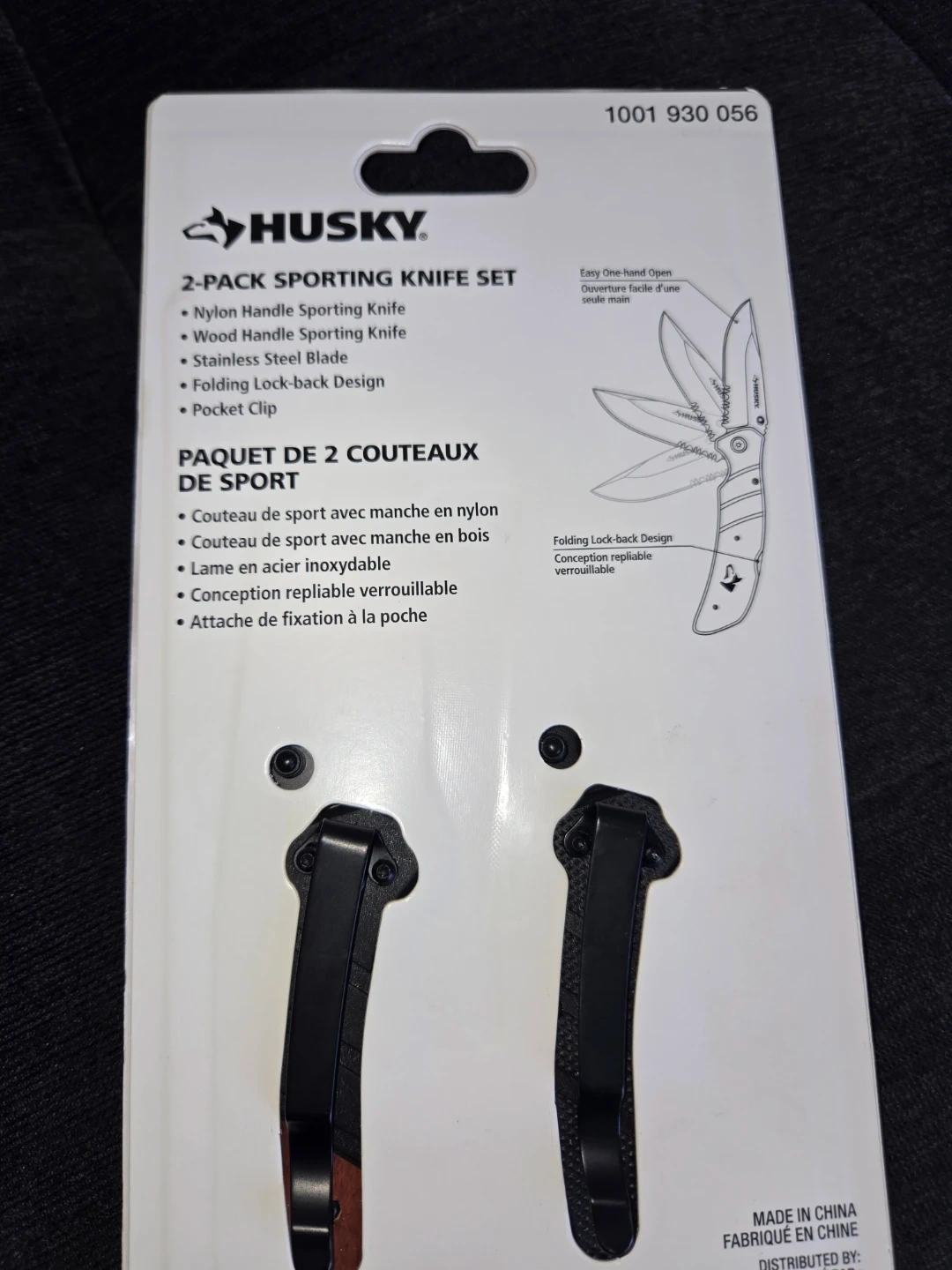 This set includes two sporting knives. One knife features a nylon handle and the other has a wood handle. Both knives have stainless steel blades and a folding lock-back design with a pocket clip. They're great for various tasks!