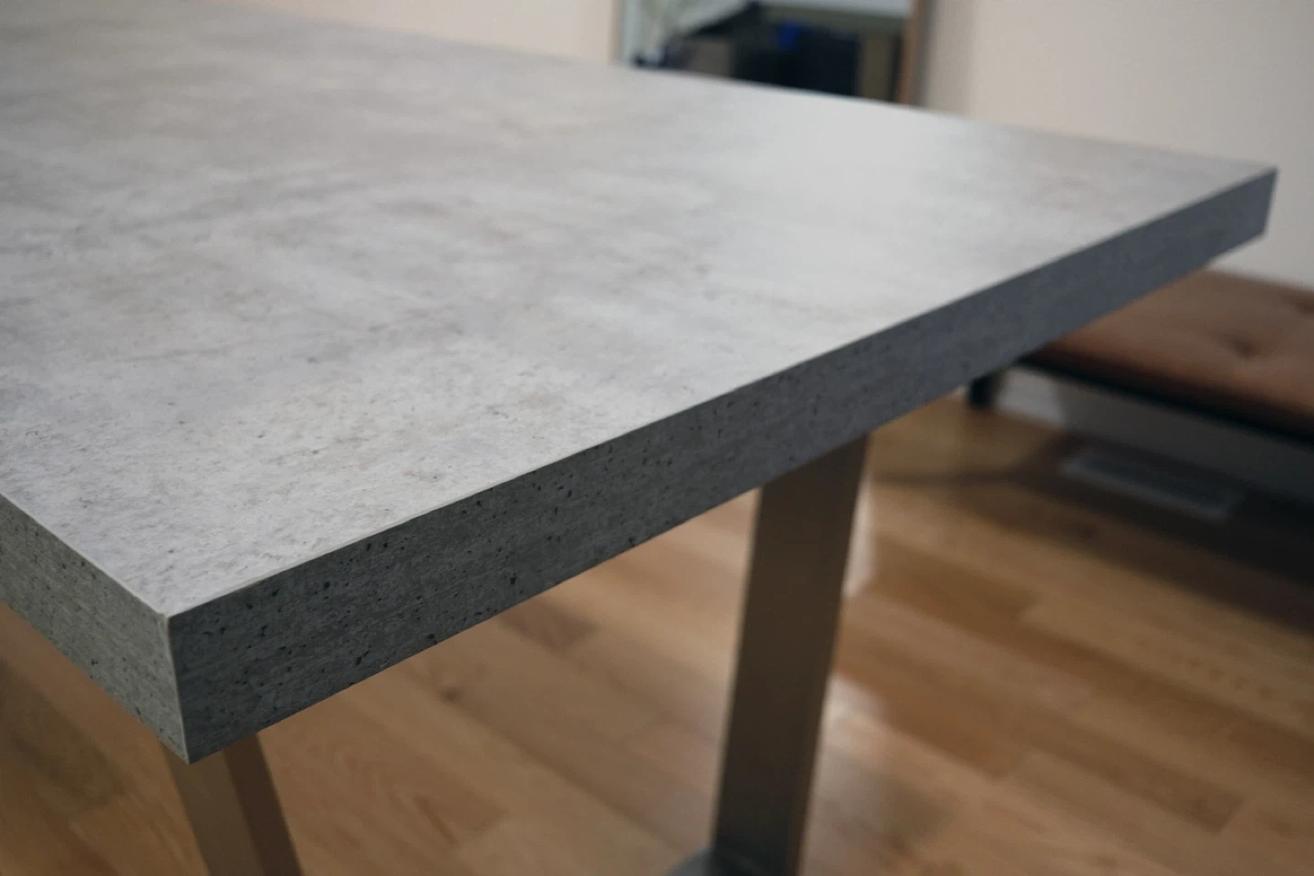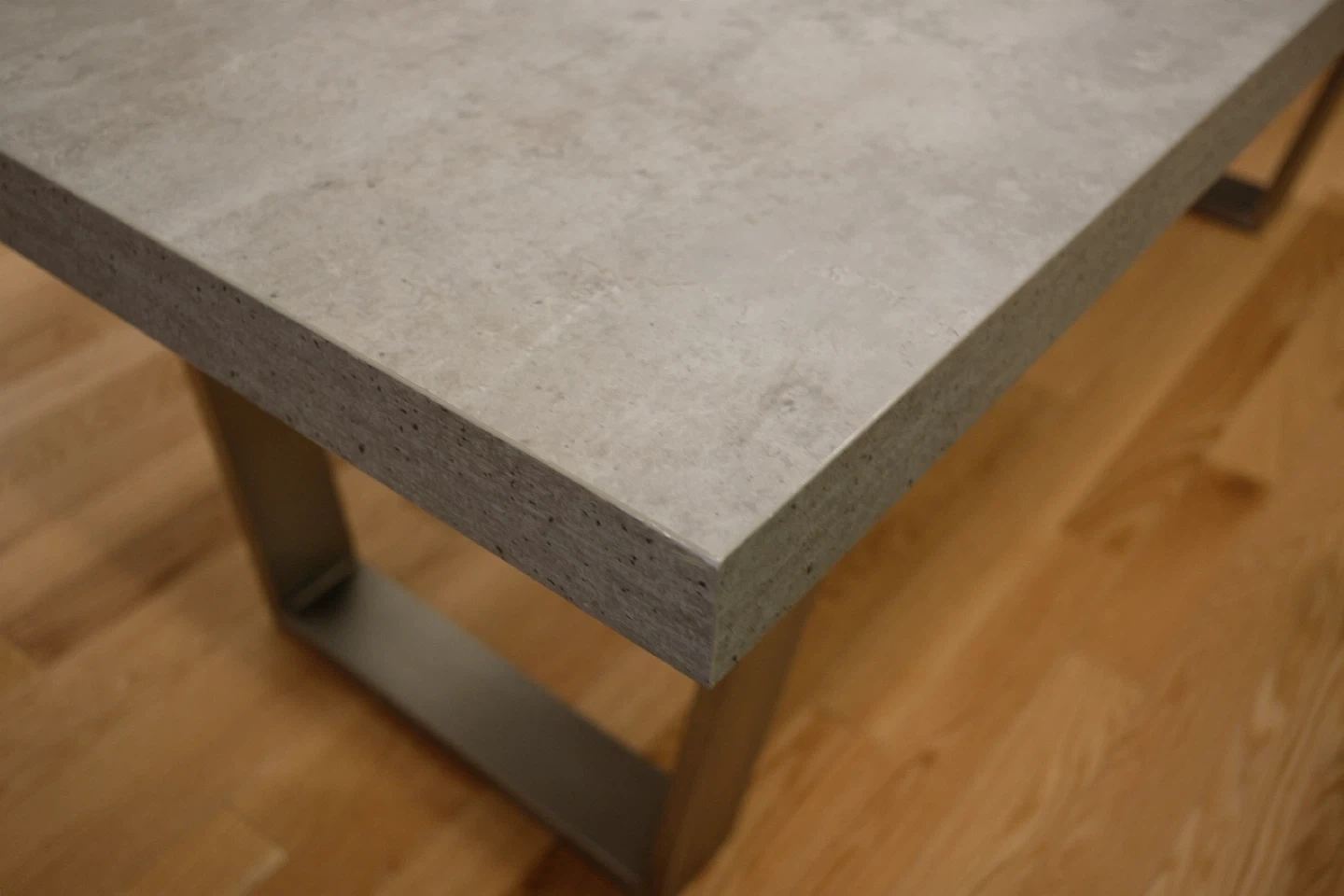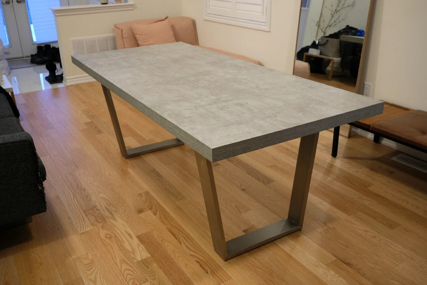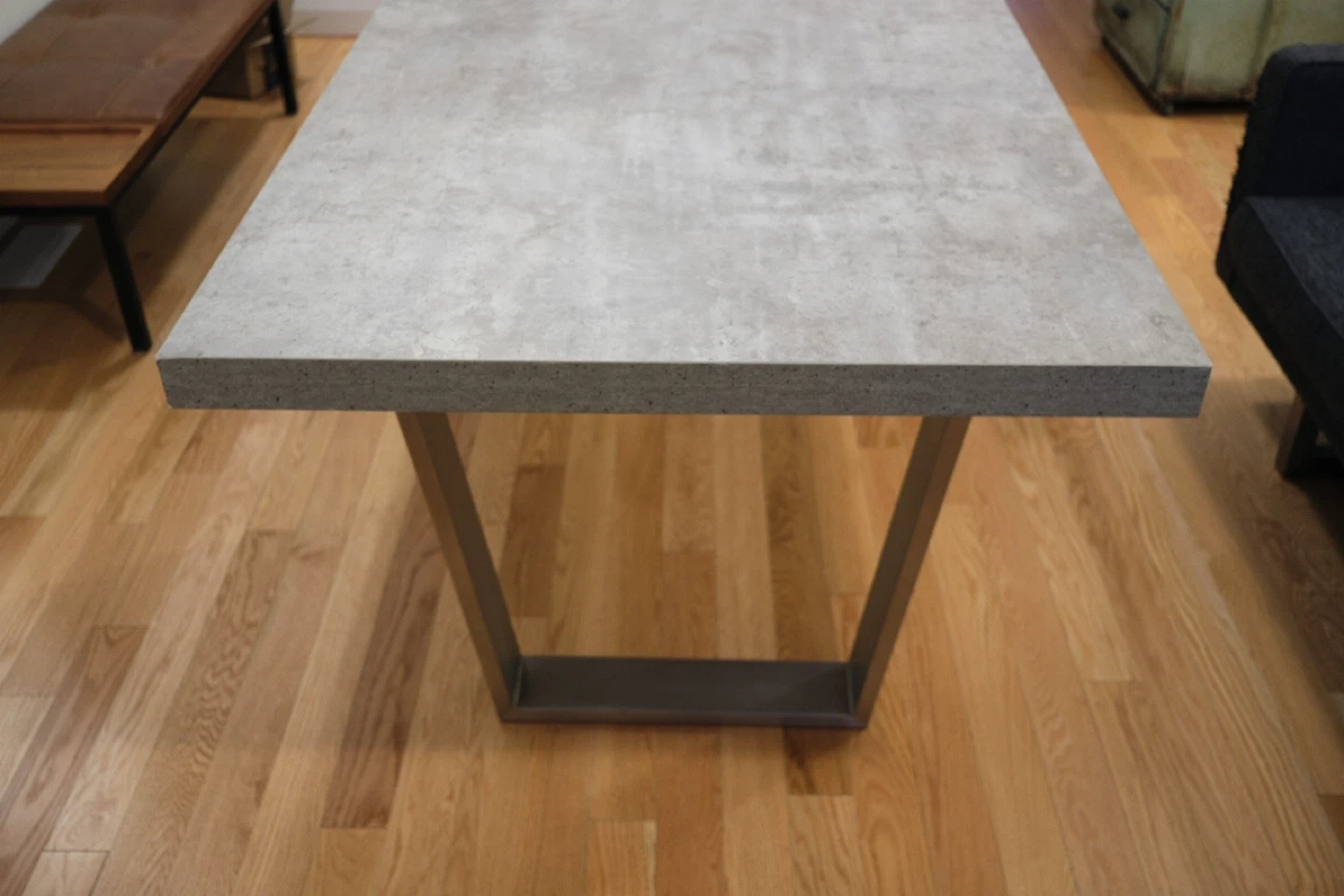 Faux concrete looks pretty real (everyone asks me if its real concrete). Bought 850$ selling 180$. Legs are brush steel but can be replaced, its 4 easy bolts to remove.