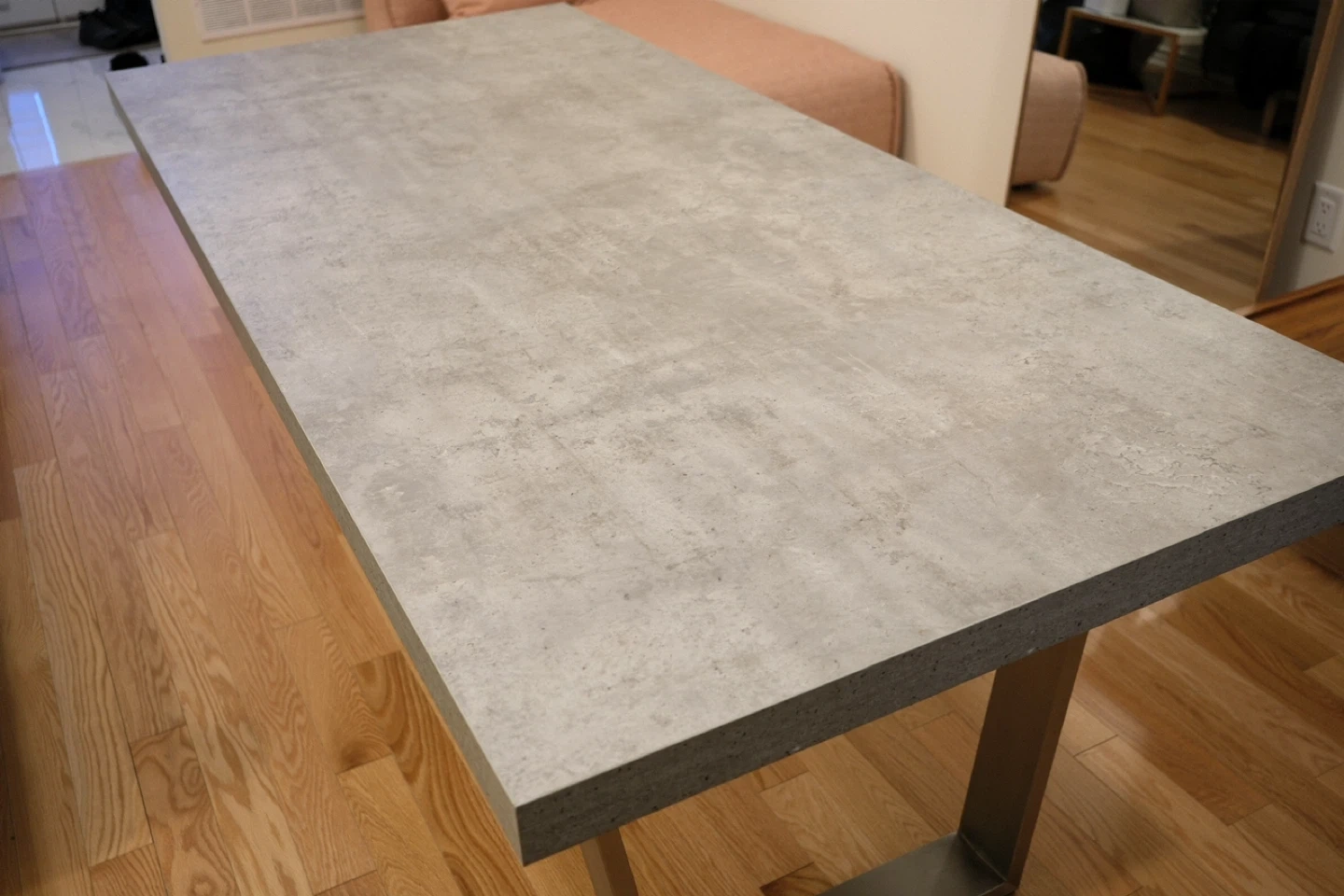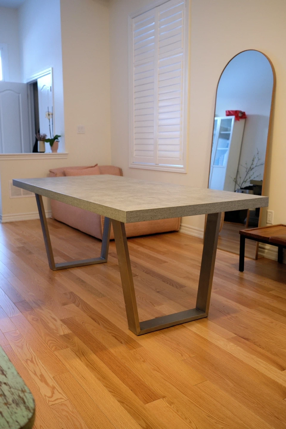 Faux concrete looks pretty real (everyone asks me if its real concrete). Bought 850$ selling 180$. Legs are brush steel but can be replaced, its 4 easy bolts to remove.
