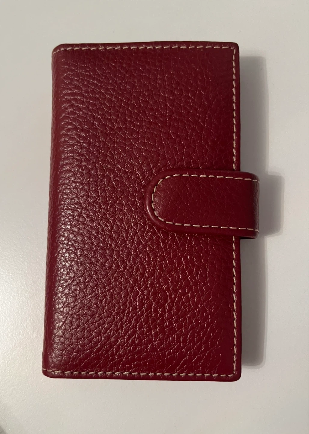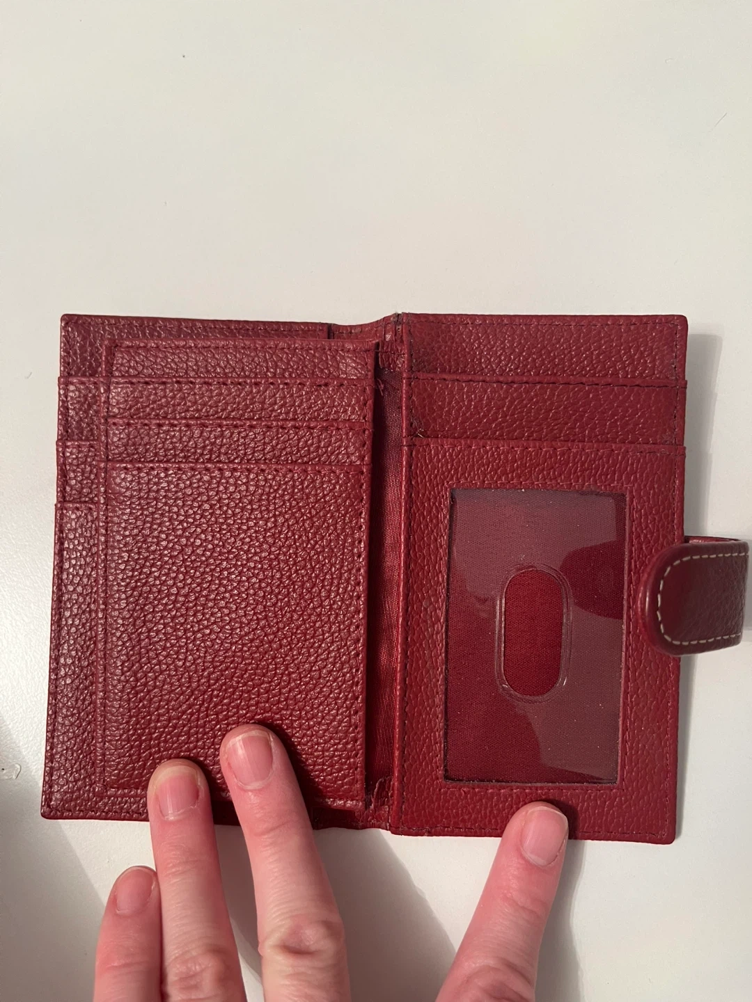 This red bifold wallet is made from genuine leather with a textured finish. It features multiple card slots and a clear ID window. It's compact and functional! Small crack in the inside as shown in last photo.