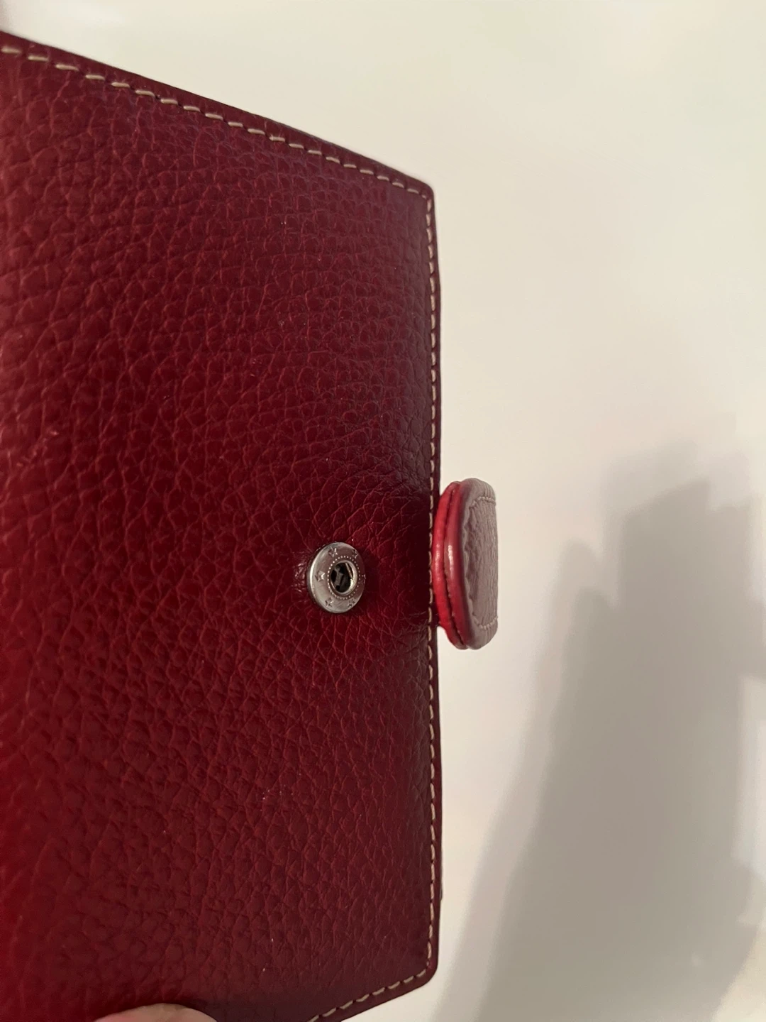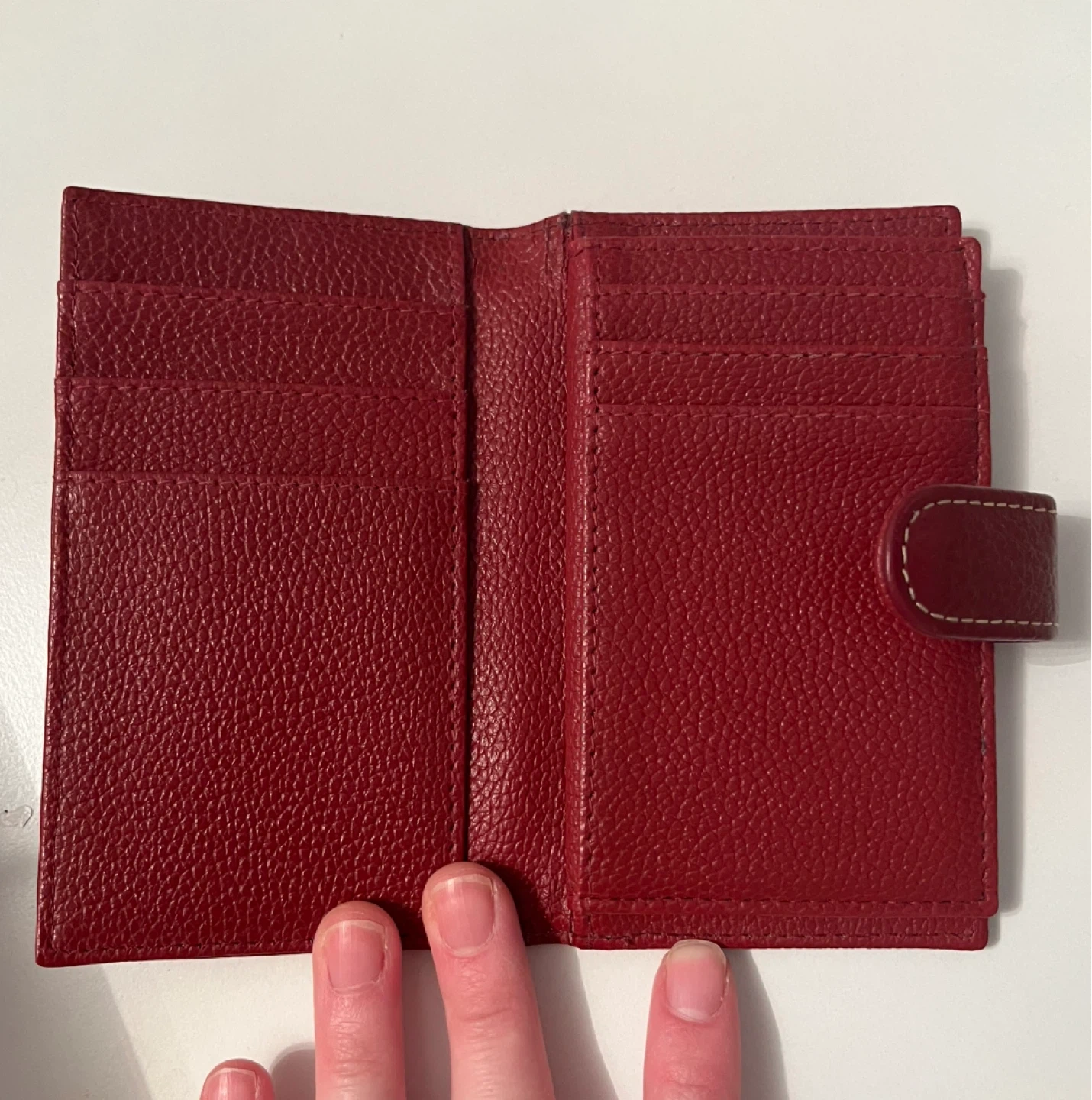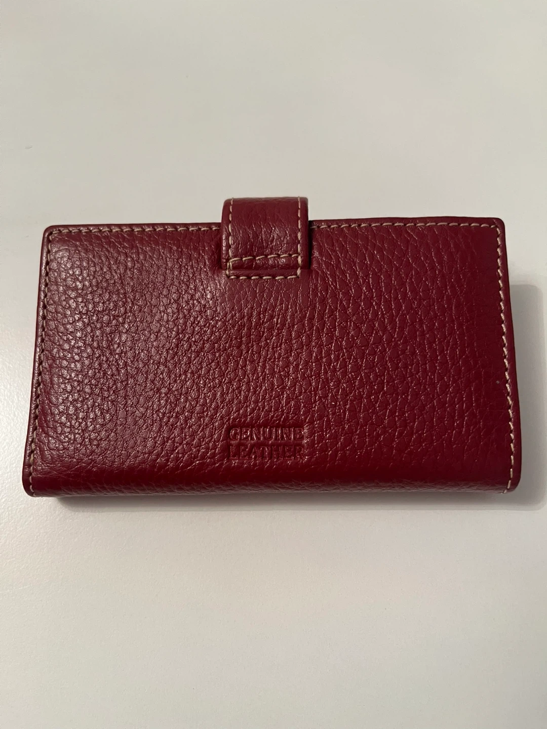 This red bifold wallet is made from genuine leather with a textured finish. It features multiple card slots and a clear ID window. It's compact and functional! Small crack in the inside as shown in last photo.