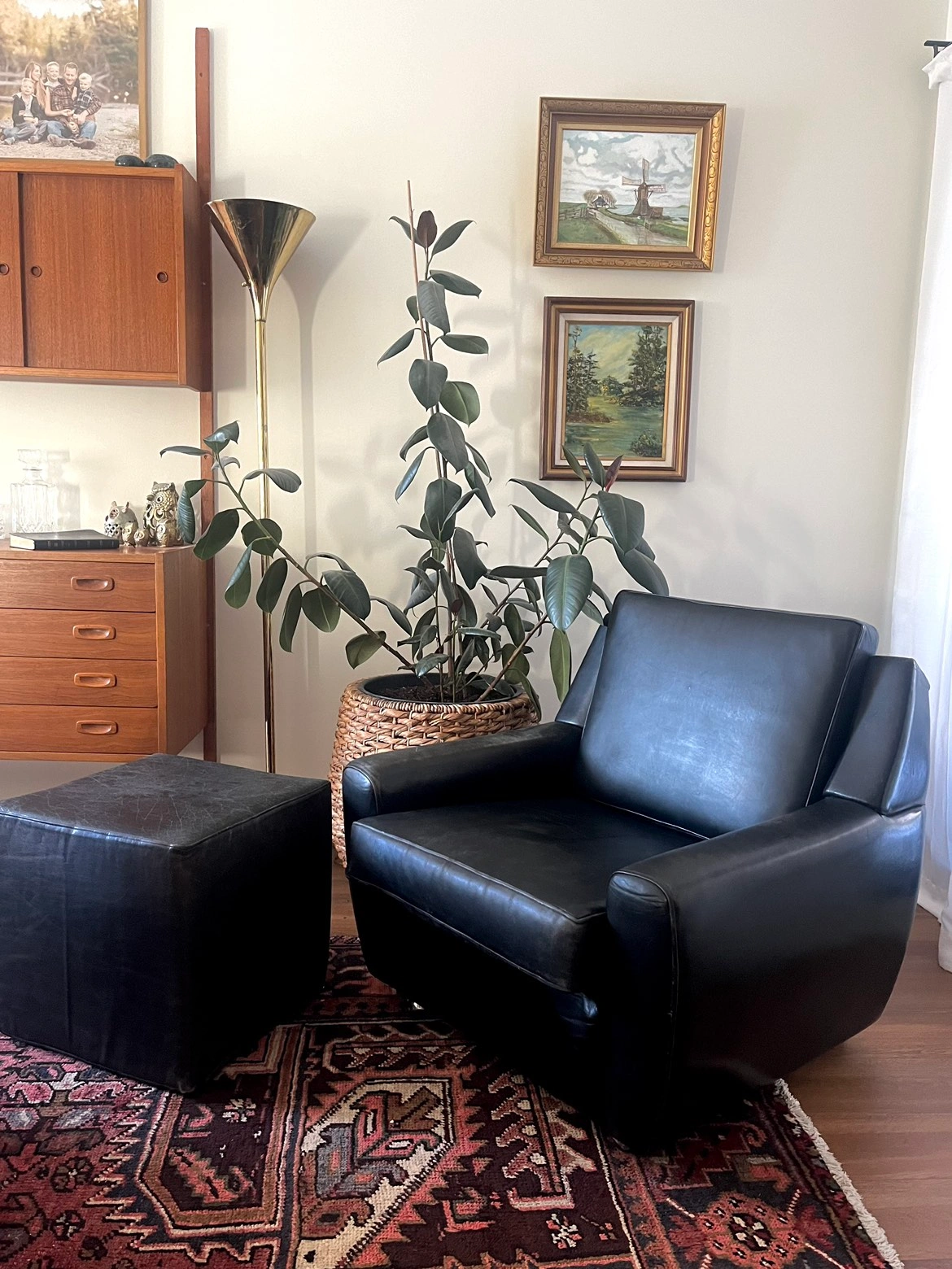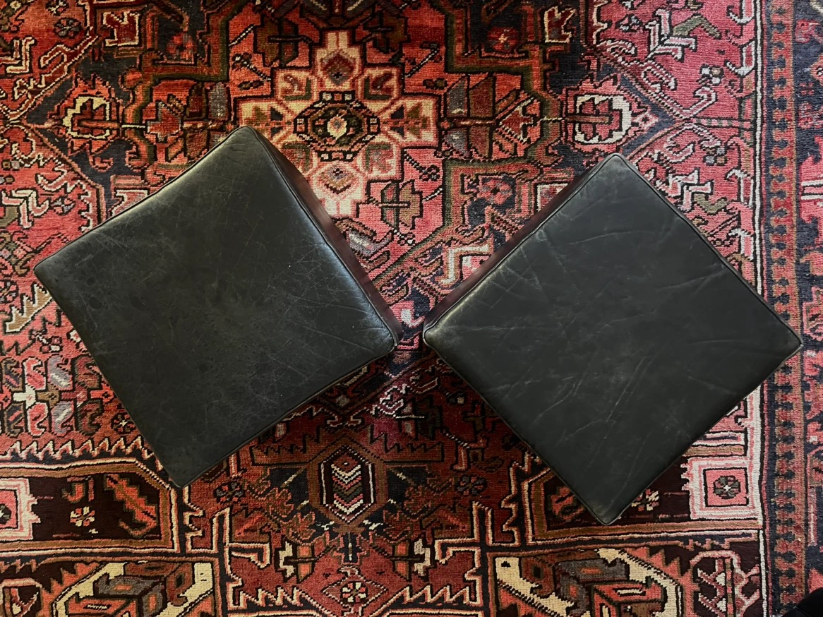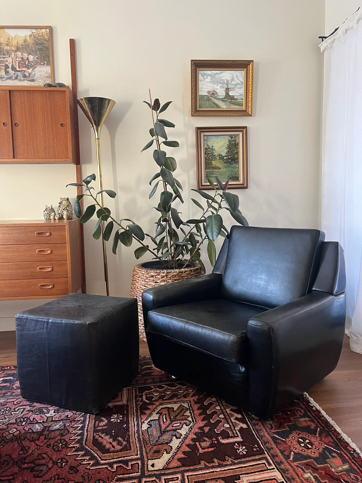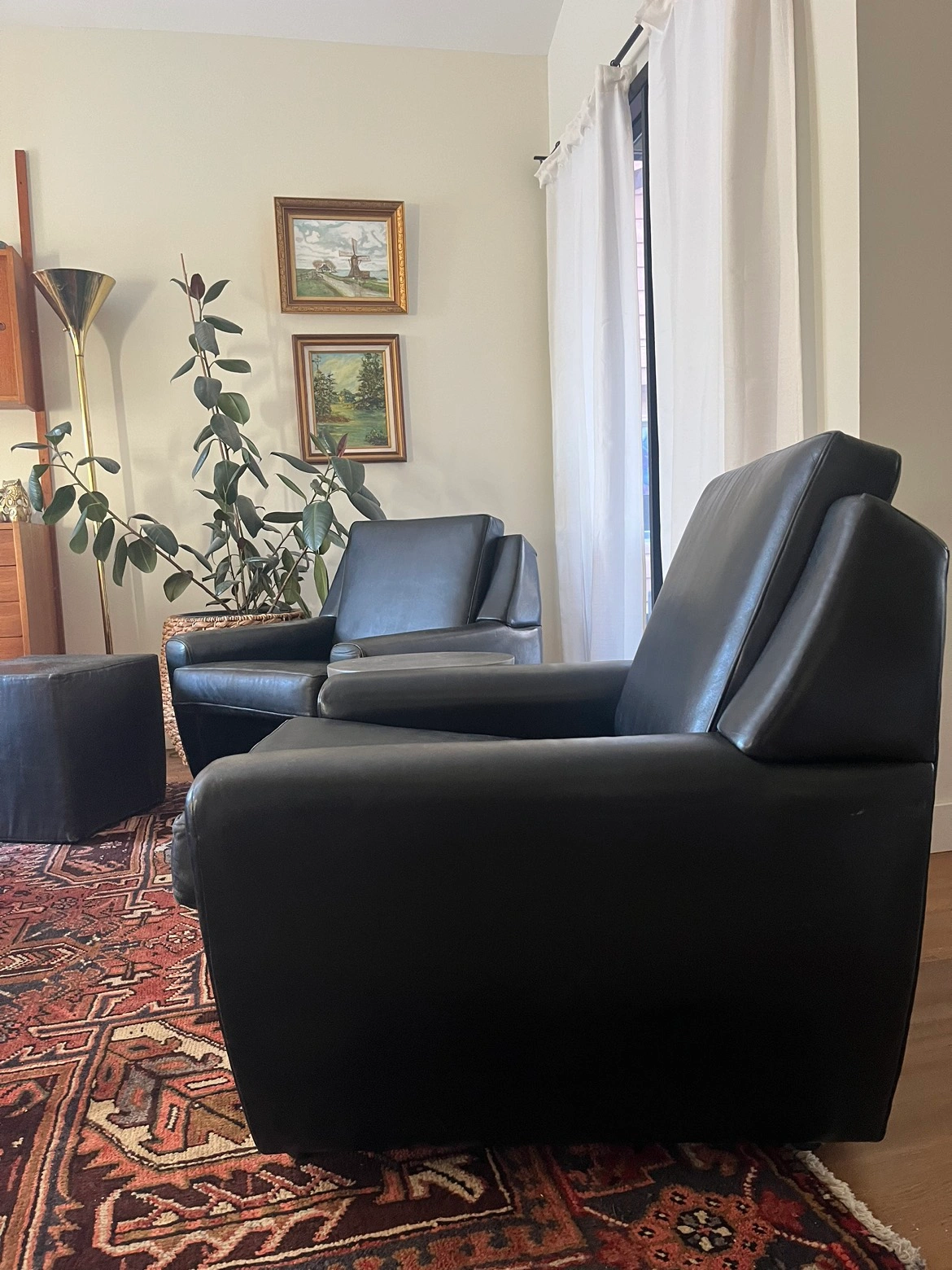 Selling this set of 1970’s custom made in Germany leather chairs with matching ottomans (x two).