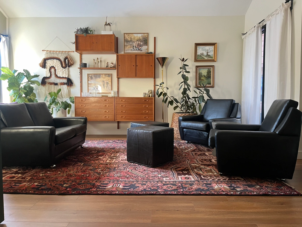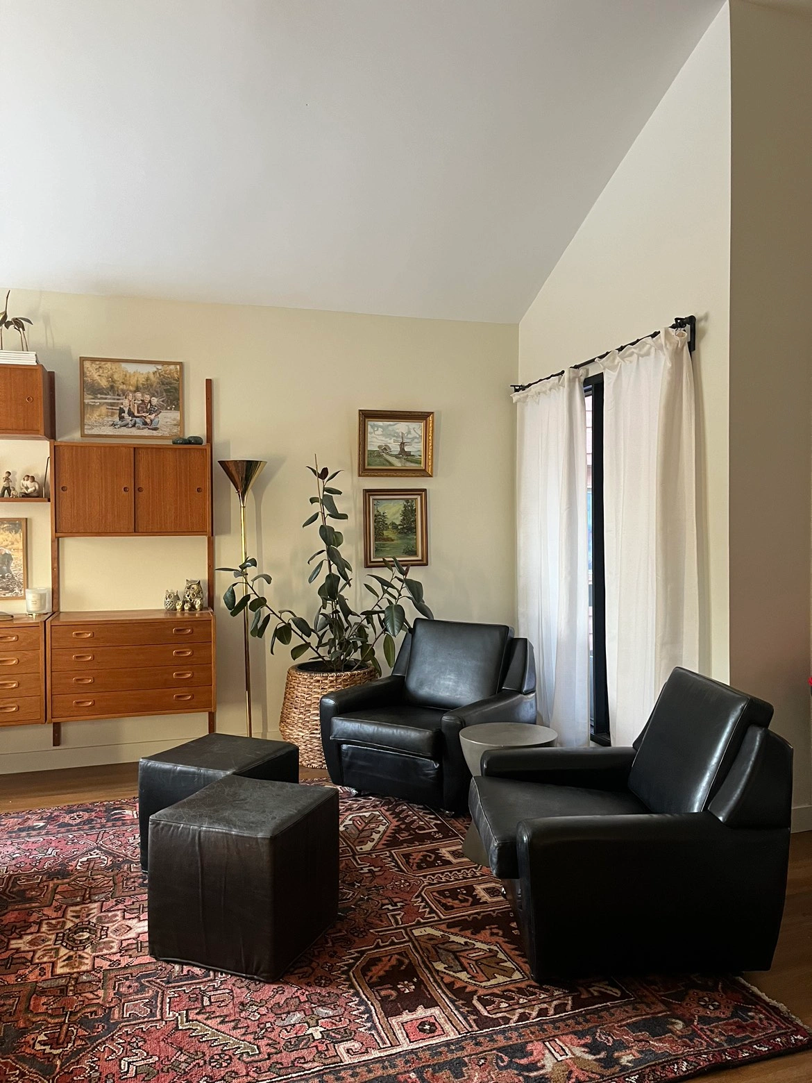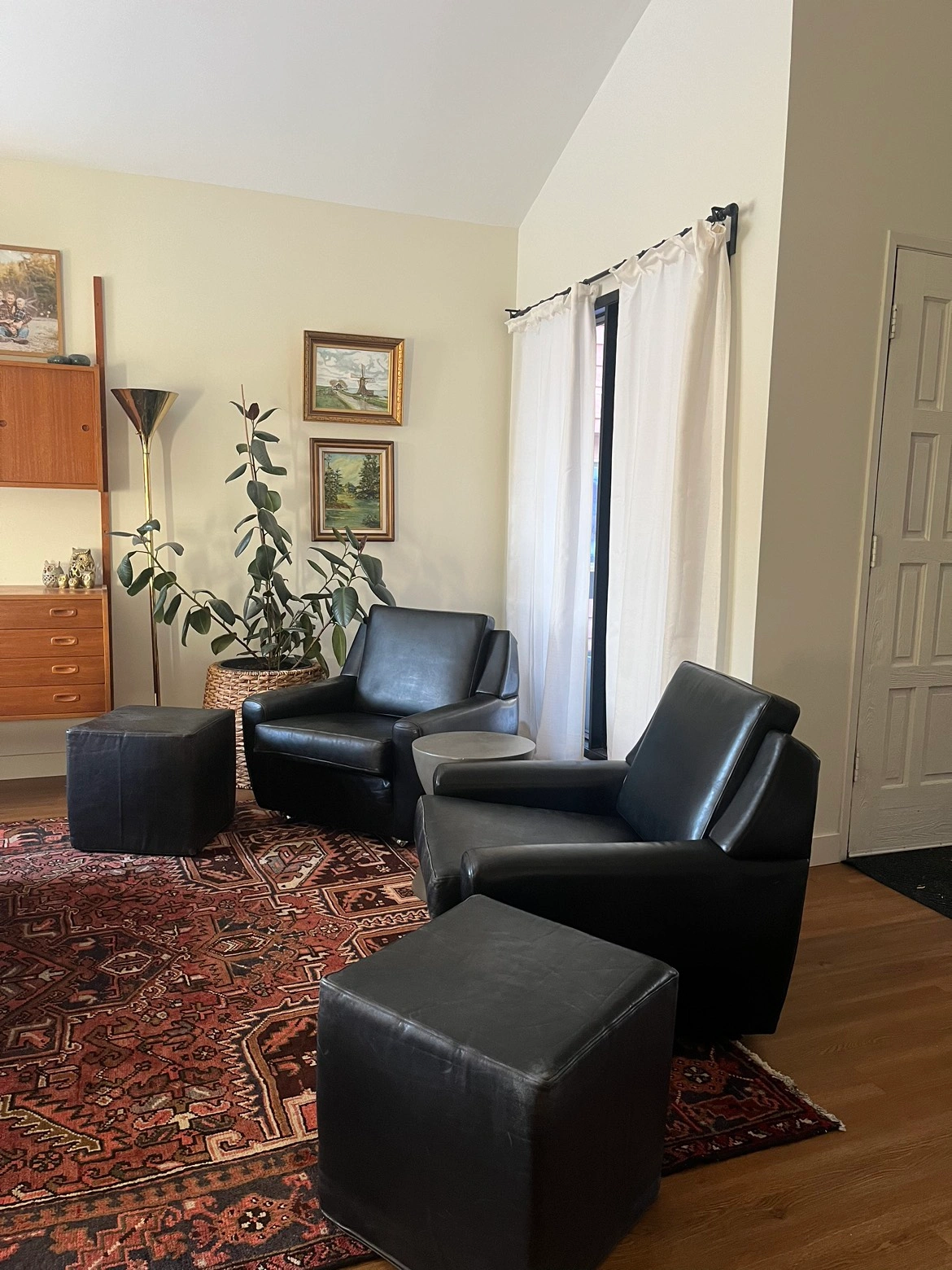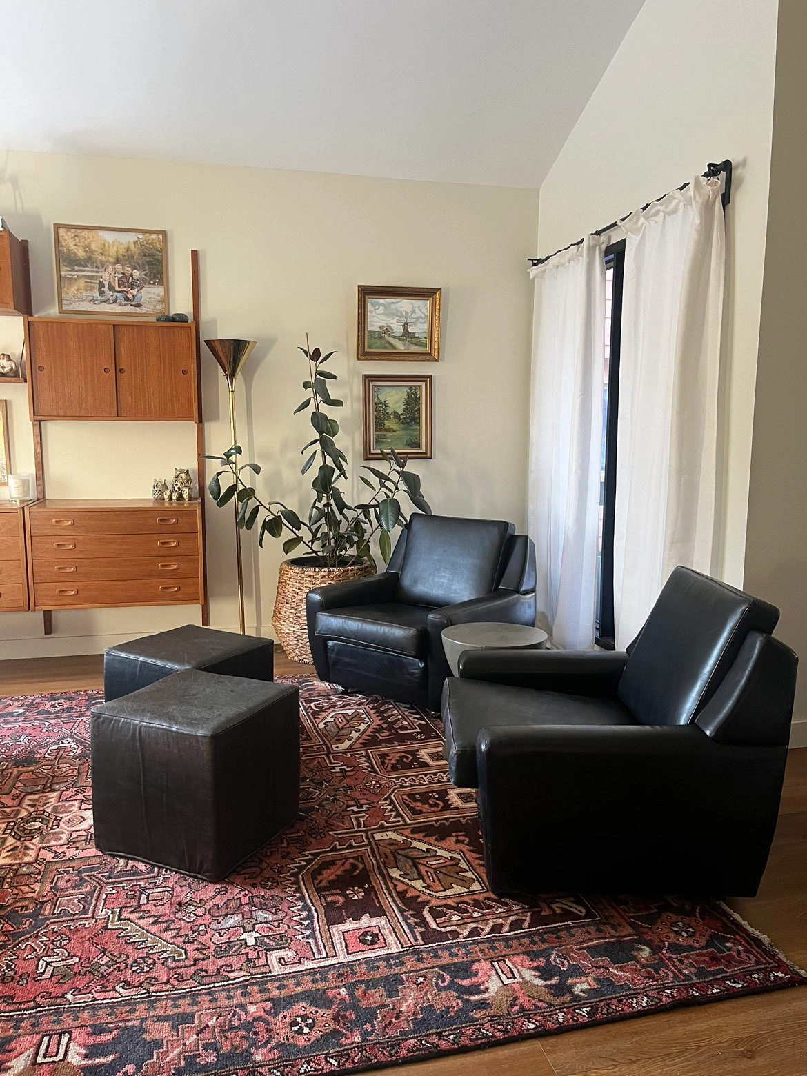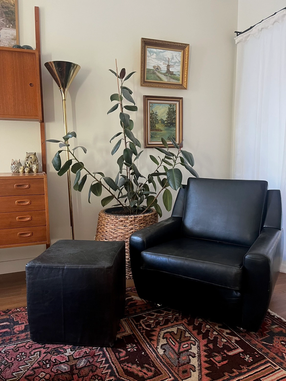 Selling this set of 1970’s custom made in Germany leather chairs with matching ottomans (x two).
