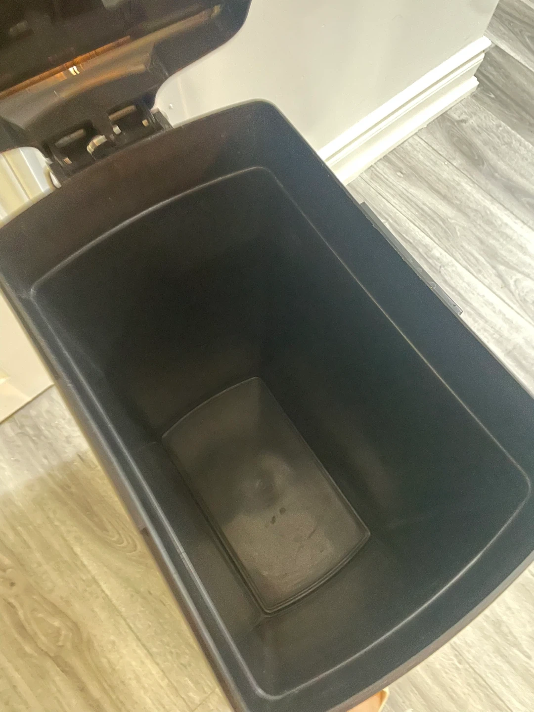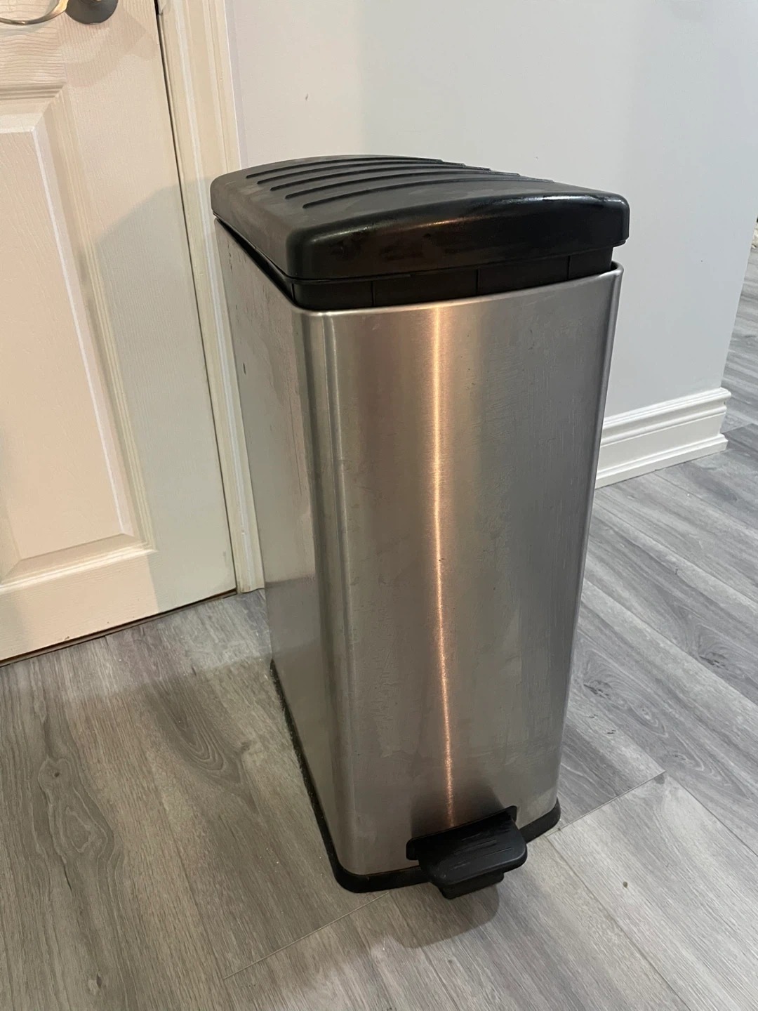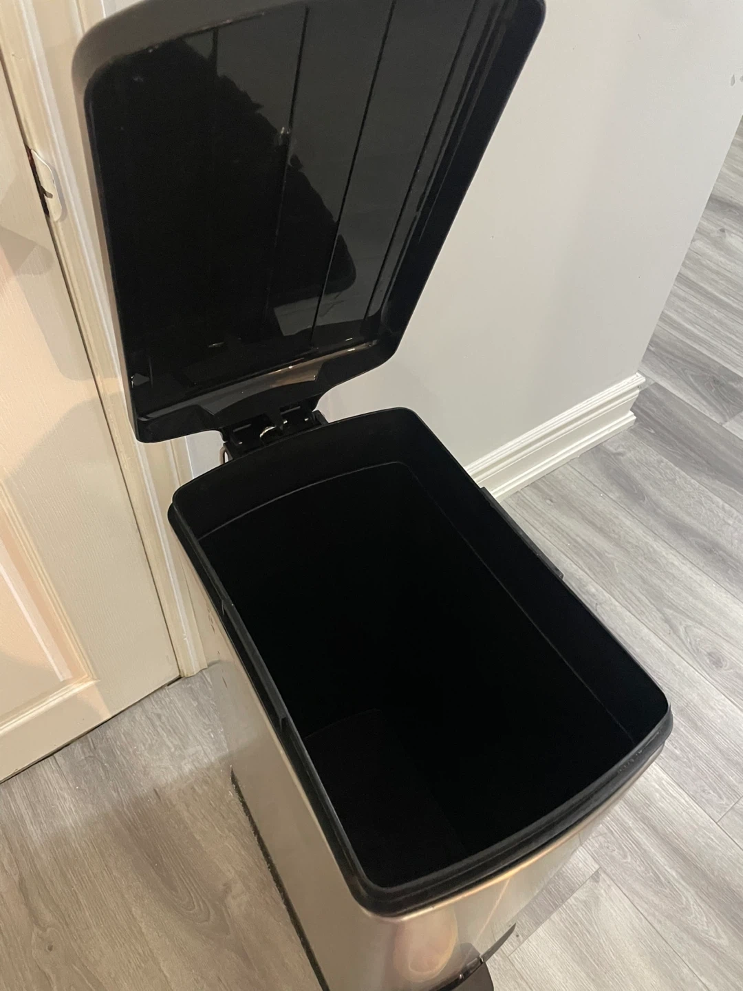 This is a stainless steel step trash can with a black lid. It has a foot pedal for easy opening. The inner bucket is removable for cleaning. It's a great addition to any kitchen or bathroom!