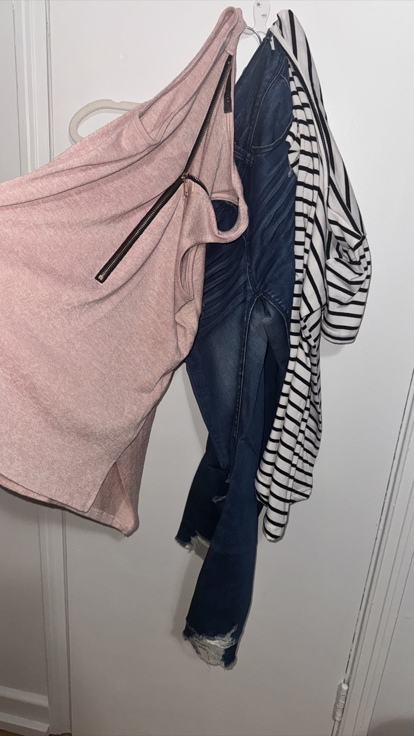 Bundle includes a blush pink, long-sleeve zippered sweater, a pair of dark wash denim jeans with distressing at the hem, and a black and white striped top. Great for casual wear.