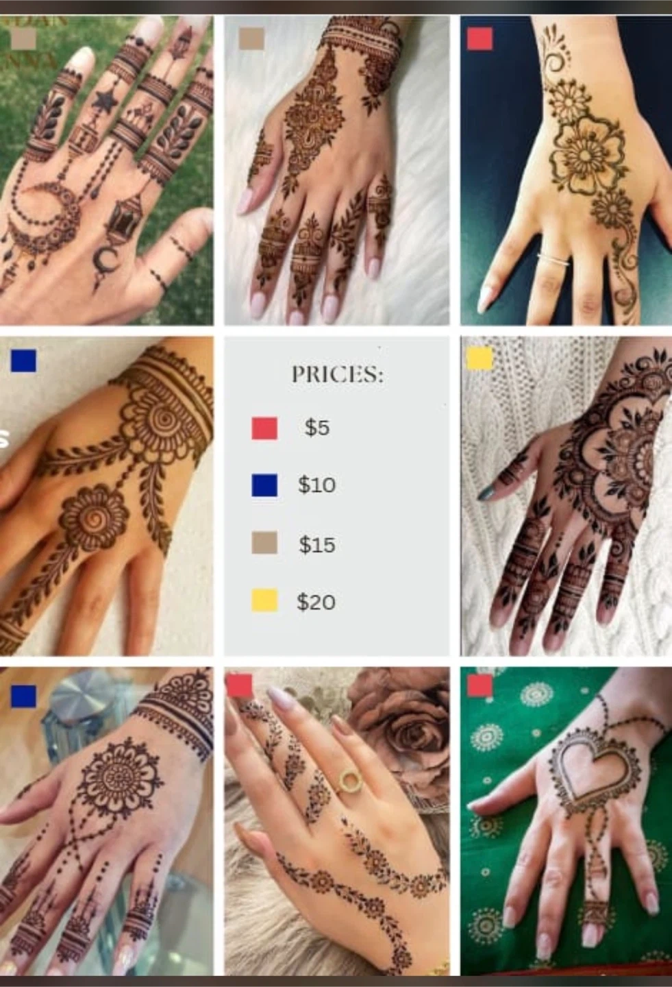 Buy & SellHenna Tattoo DesignsHenna Tattoo Designs$10Various intricate henna tattoo designs available. Pricing starts at $5. Perfect for parties or special occasions!ConditionNewWHERE TO MEETCheck LocationView MapSELLERmarviMalvern967 reviews1 chats·0 favorites·27 viewsSEND CHAT TO SELLERHi marvi! I’m interested in your listing.Hi marvi! I’m interested in your listing.Get the Karrot app to chatSign In to chat