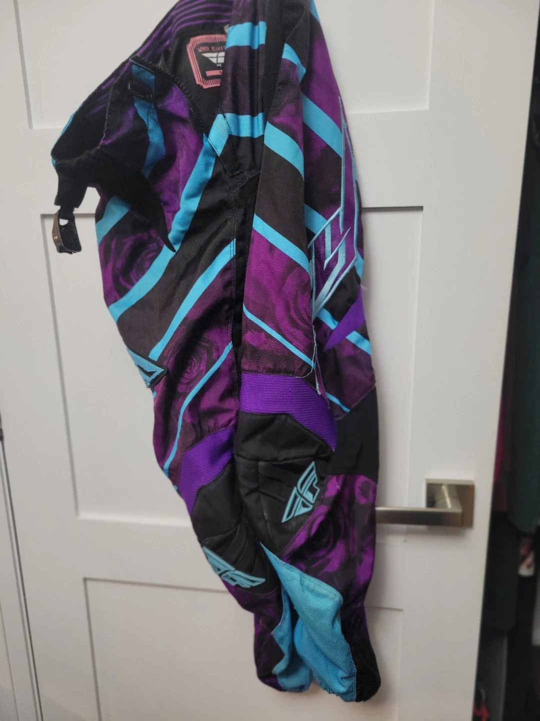 This is a FLY Racing motocross set. It features a vibrant purple, black, and blue design with rose patterns on the lower front and back. The jersey is made of breathable mesh material with long sleeves. Really comfy! Jersey size Medium pants 9/10 fits more like a 6/8