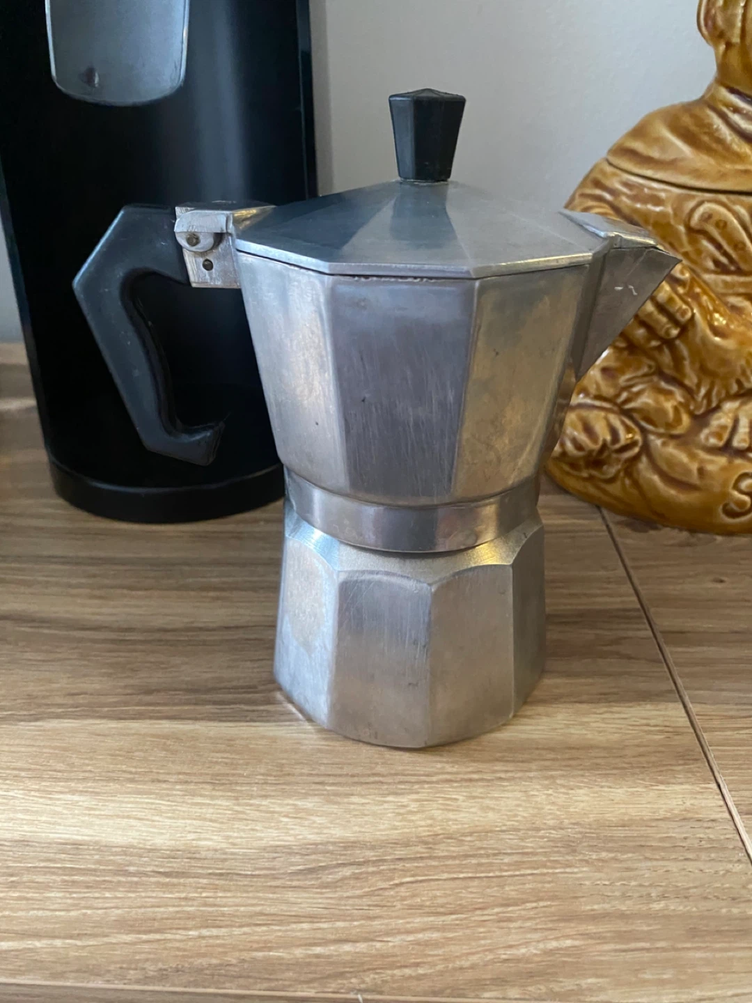 This is a classic aluminum moka pot for stovetop espresso. It's made of durable aluminum and has a sturdy black handle. It's a great way to make strong coffee at home!
