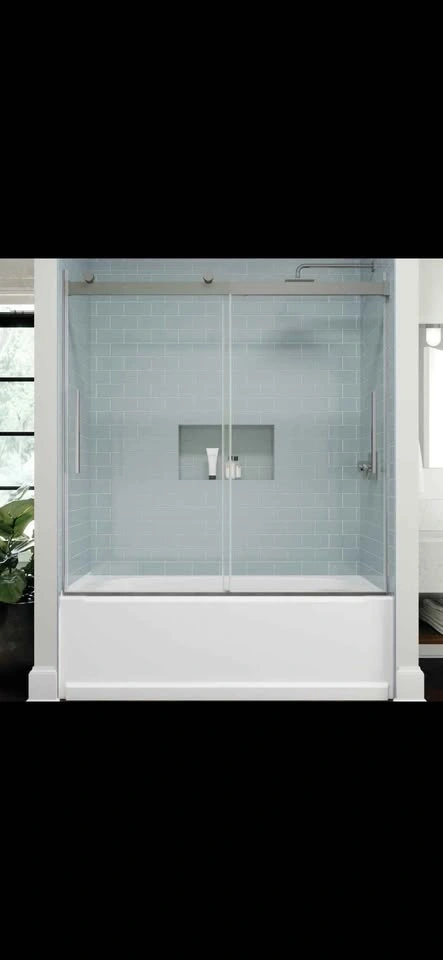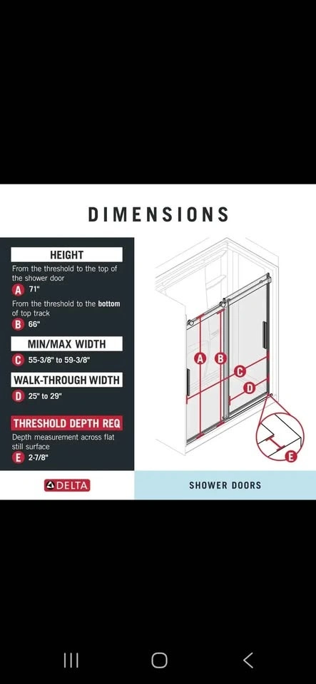 Fits openings from 55-3/8 in. to 59-3/8 in. wide and is 71-1/8 in. high. Offers a walk-in width of 25-1/2 to 29-1/2 in. and a walk-through height of 66 in. Accommodates up to 3/8 in. out-of-plumb.