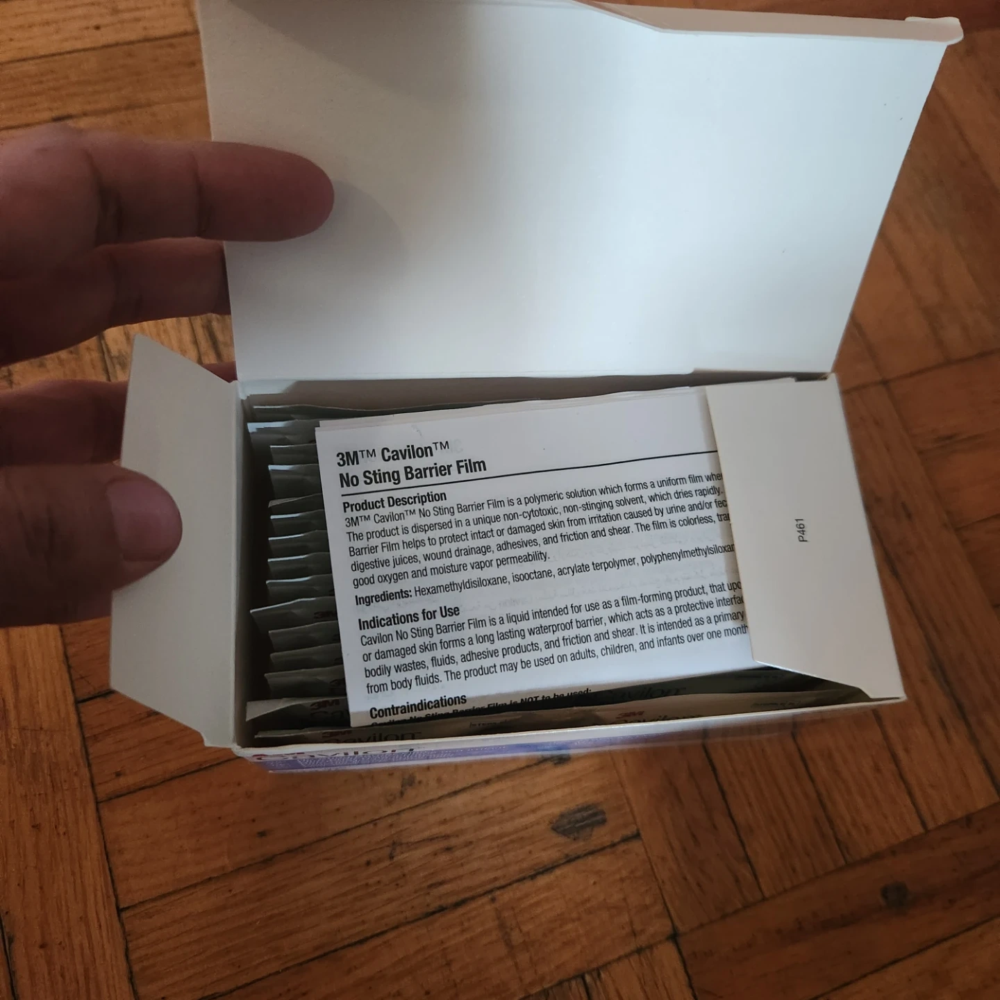 3M Cavilon No Sting Barrier Film is a non-cytotoxic, non-flammable liquid that dries quickly to form a uniform film. It helps protect intact or damaged skin from urine and/or fecal incontinence, wound drainage, adhesive stripping, and friction. Each wipe is 1mL.
