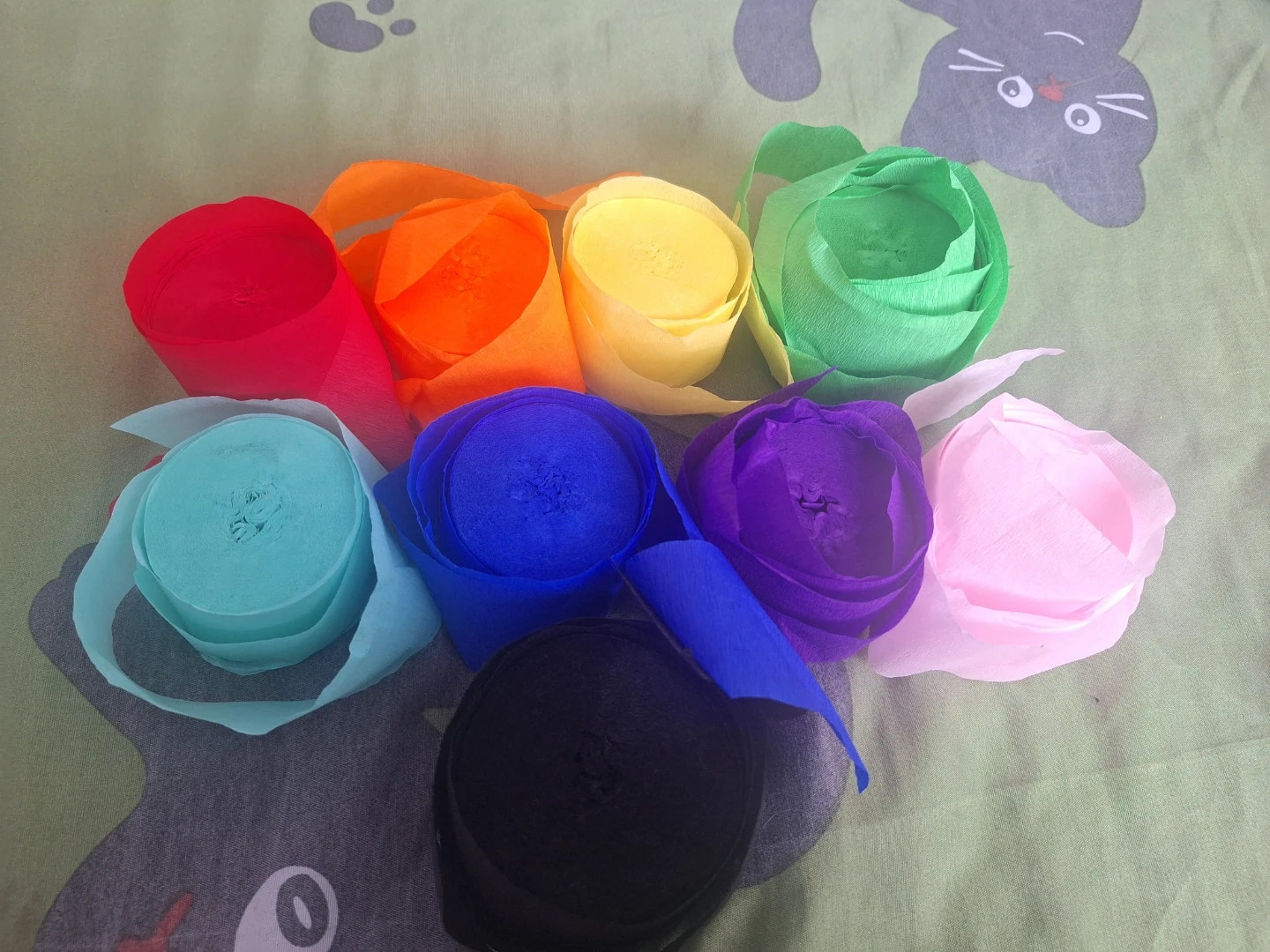 Set of 8 rolls of crepe paper streamers in assorted rainbow colours. Great for parties and decorations. Paper material.