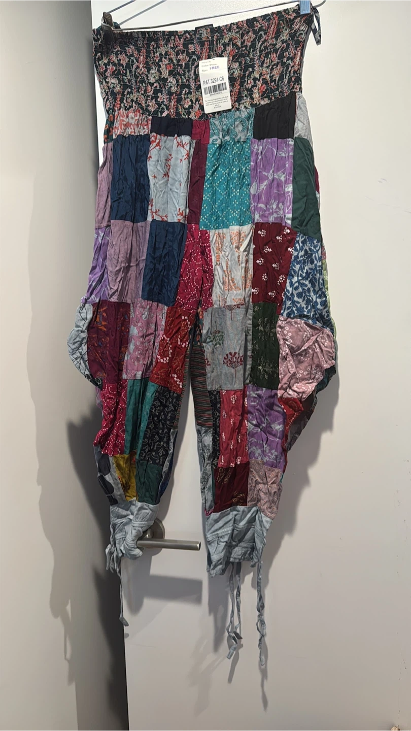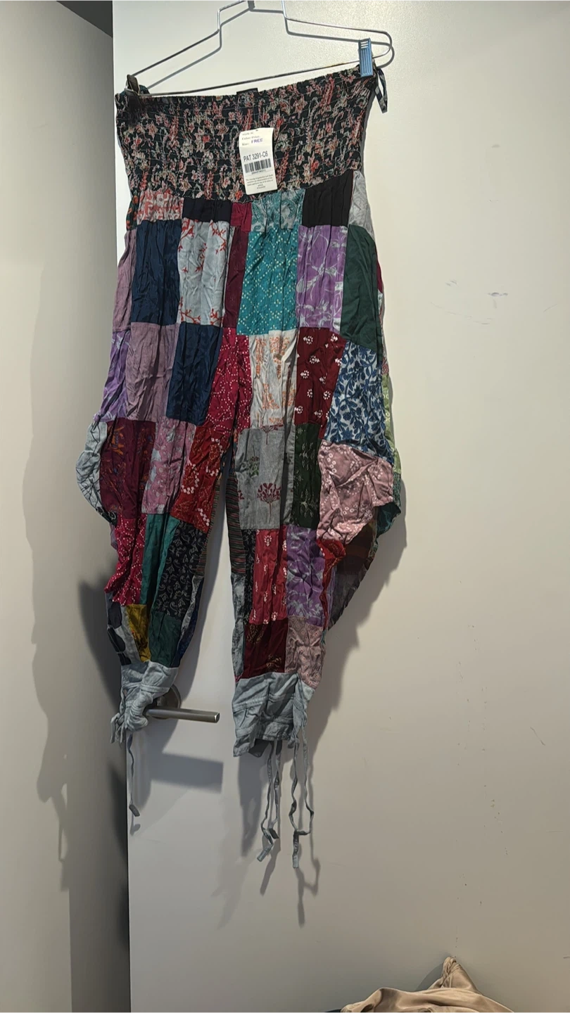 These are bohemian patchwork harem pants with an elasticated waist. The pants are made of a lightweight, breathable fabric. They're great for casual wear or lounging!