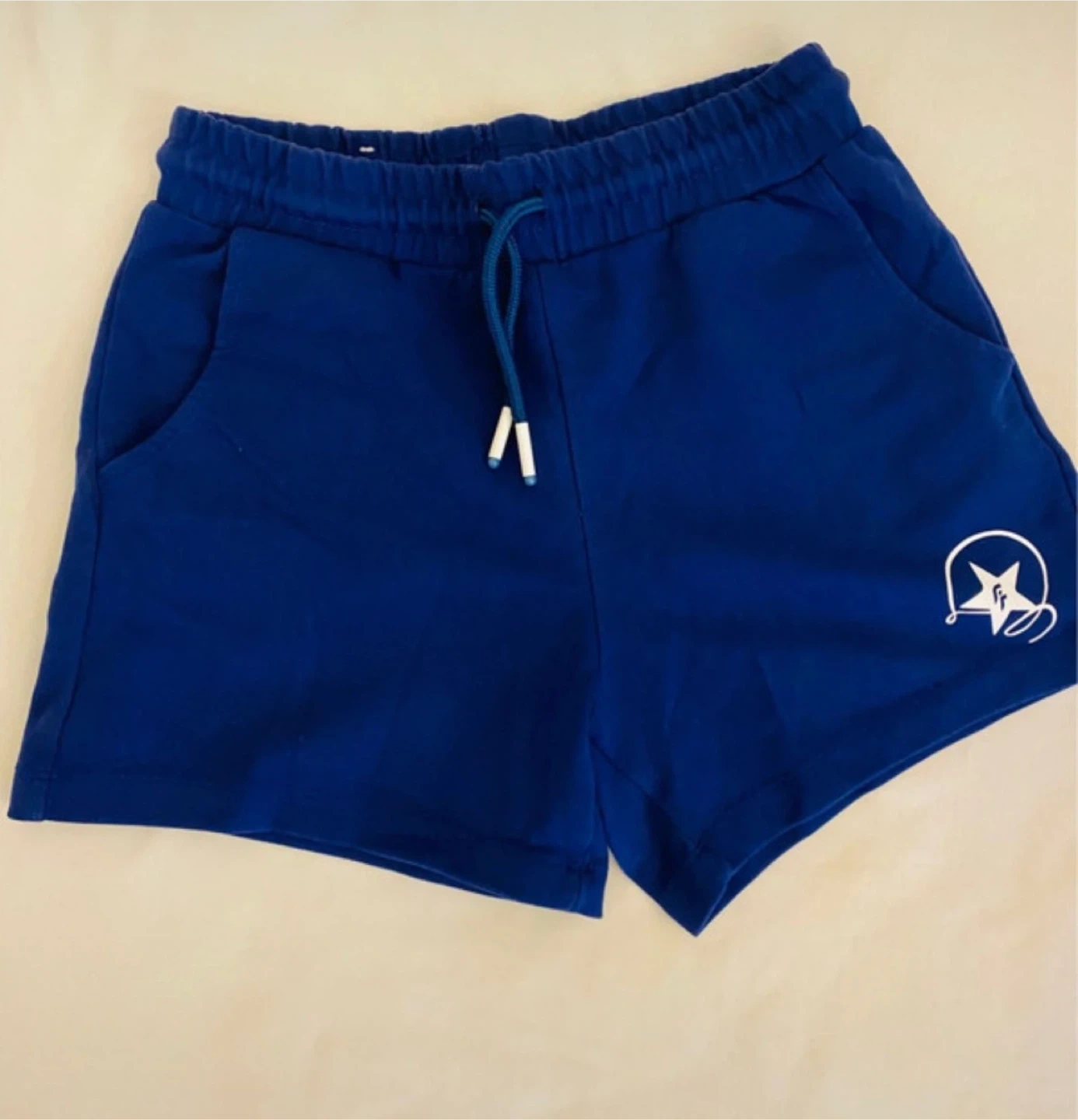 Blue athletic shorts from DeFacto Fit. Features an elastic waistband with a drawstring and side pockets. Size medium. 100% cotton fabric.