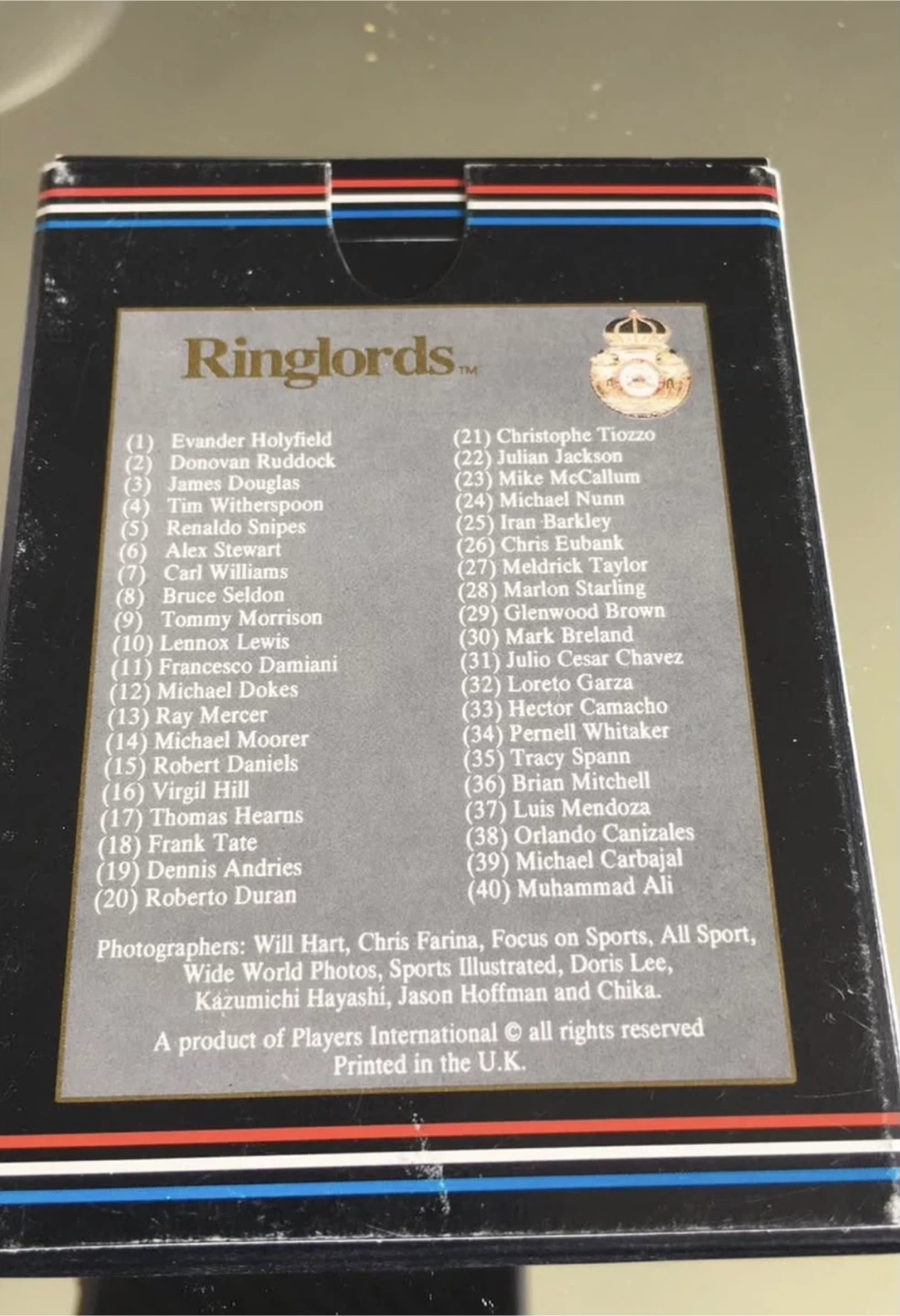 A limited edition set of 40 boxing personality cards by Ringlörds. Includes iconic boxers like Muhammad Ali and Evander Holyfield. Printed in the U.K. in 1991.