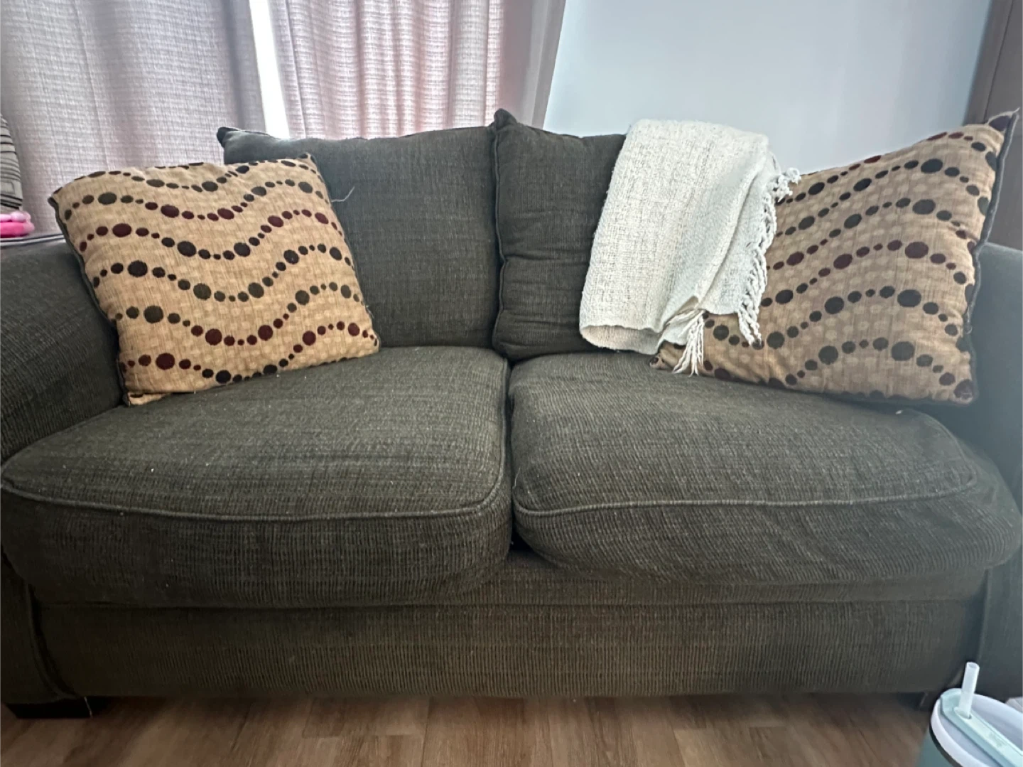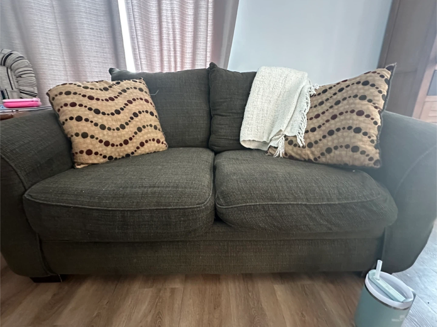 A comfortable extra deep dark green loveseat, perfect for a cozy living space. It's upholstered in a textured fabric. Includes two decorative throw pillows. It offers ample seating for two. Must be willing to pick up.