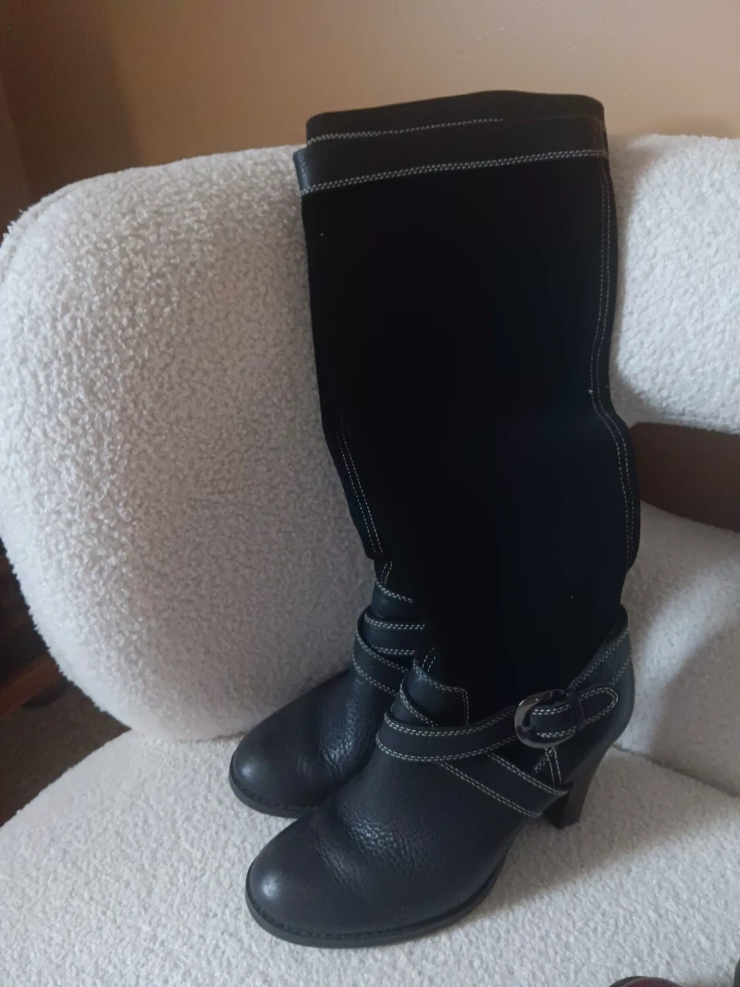 These knee-high boots feature a combination of black suede and textured leather. They have decorative straps with buckle closures and contrast stitching. The boots have a stacked heel for added height.