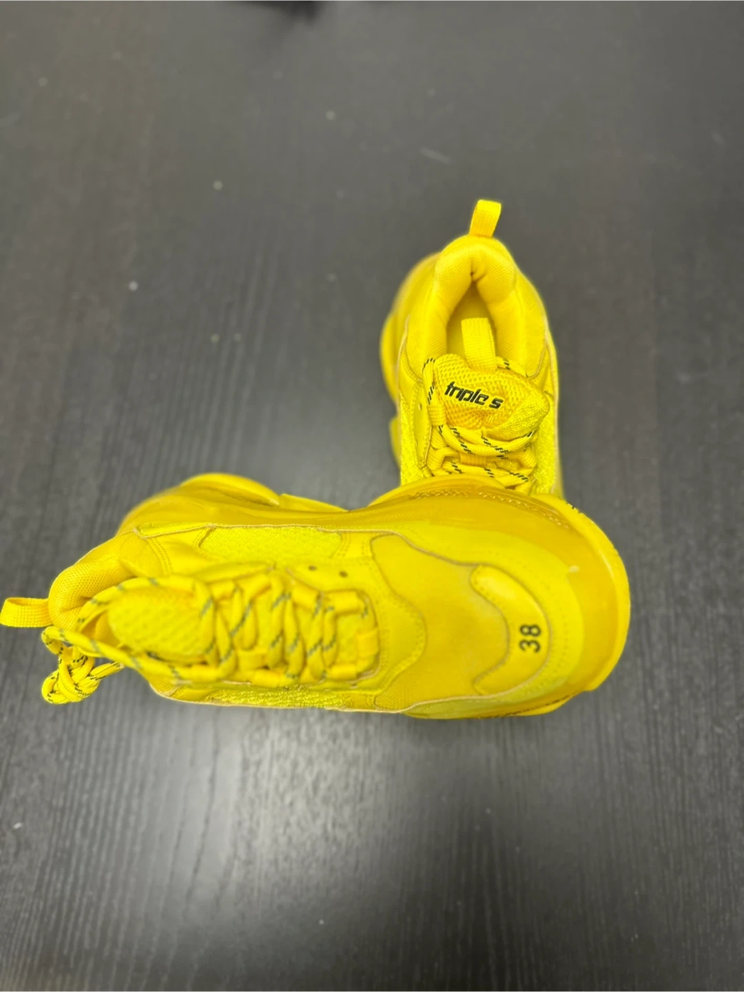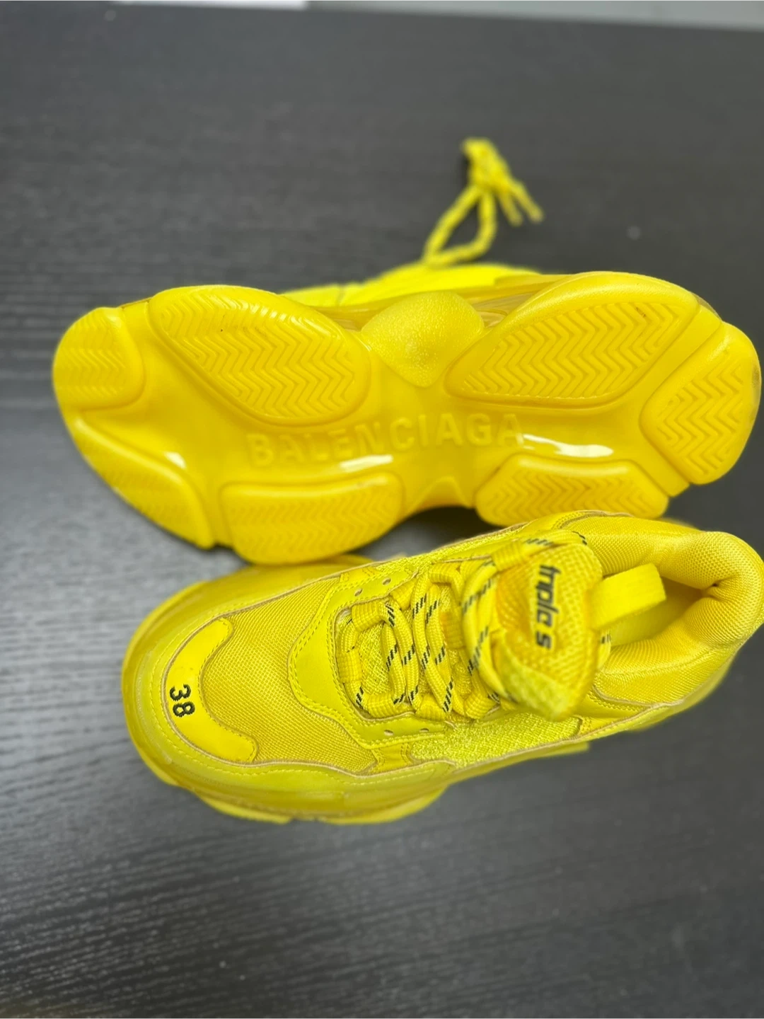 These are bright yellow Balenciaga Triple S sneakers. Size is 38. They're a bold statement piece!