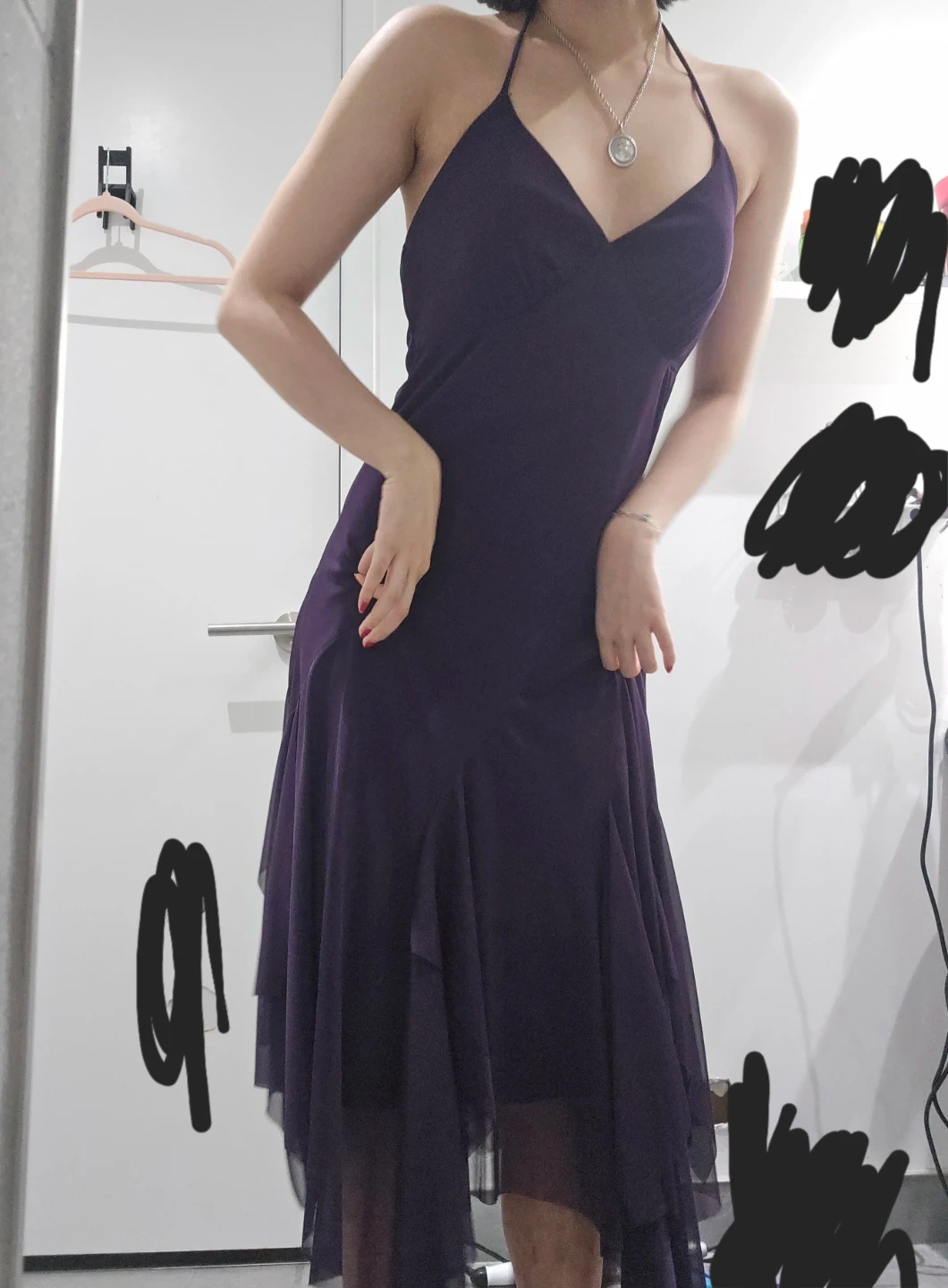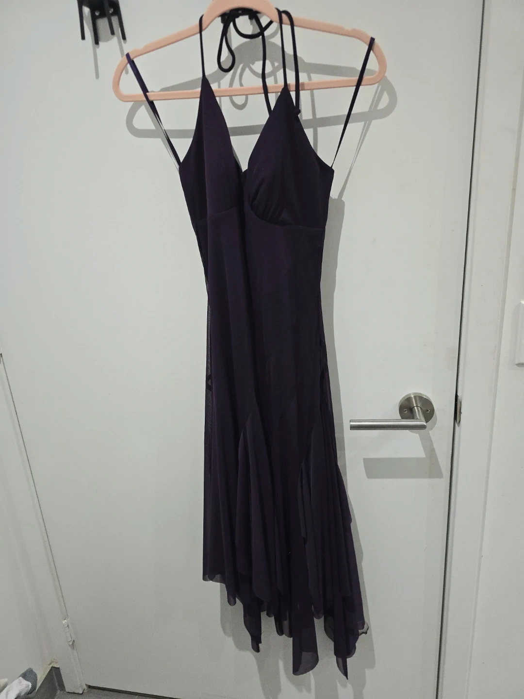 This Le Chateau dress comes in a striking purple hue with a flattering halter neck design. It's made in Canada and features a flowy, asymmetrical hemline with layered chiffon details. The fabric has a nice drape, perfect for special occasions.
