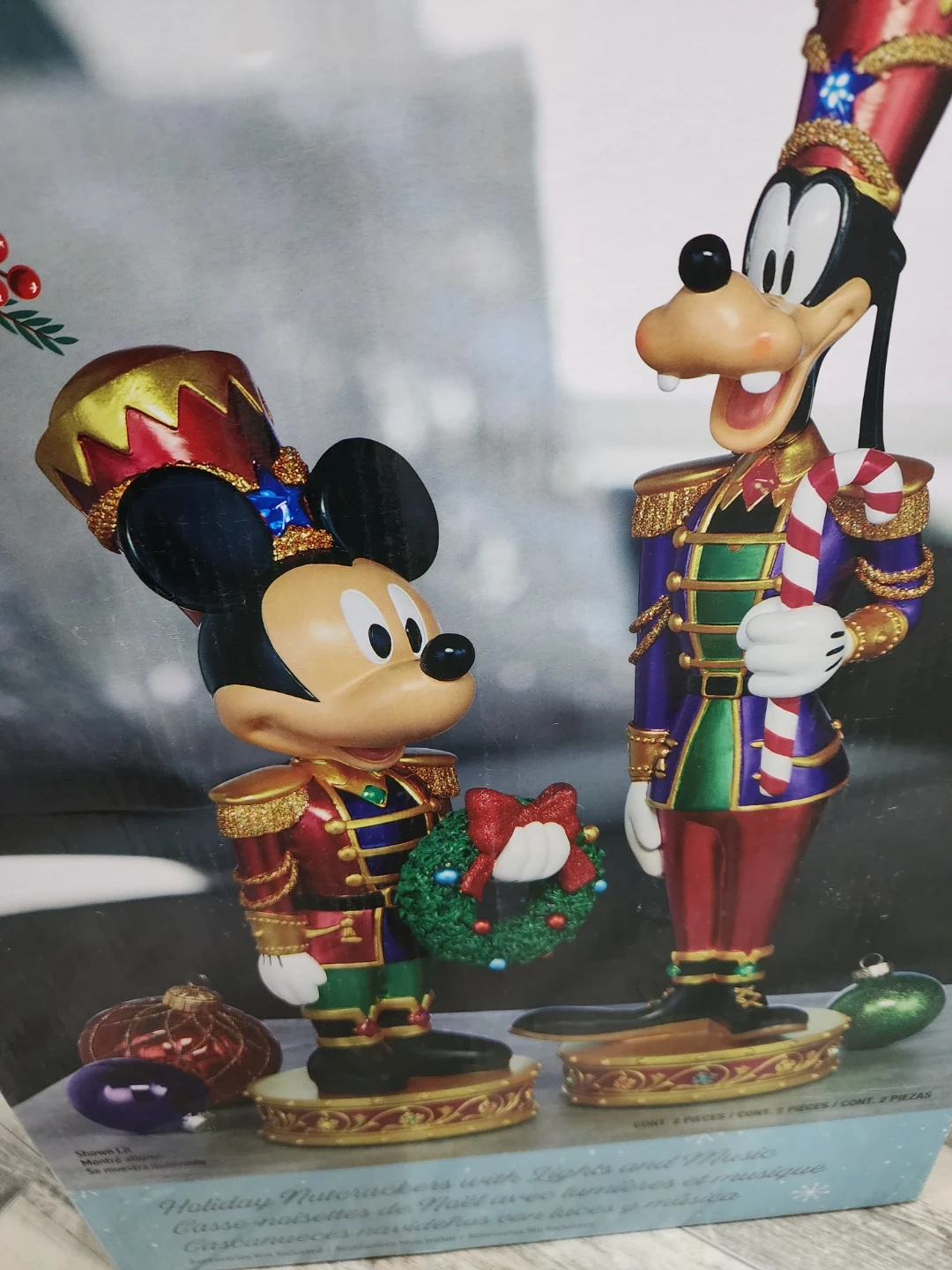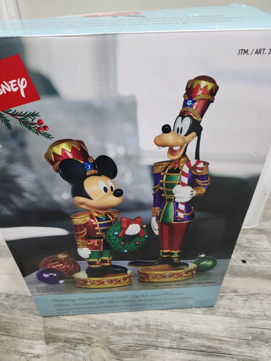 Add some festive cheer with this Disney set featuring Mickey Mouse and Goofy as holiday nutcrackers. They light up and play music to liven up your seasonal decorations. Perfect for any Disney fan's holiday display!