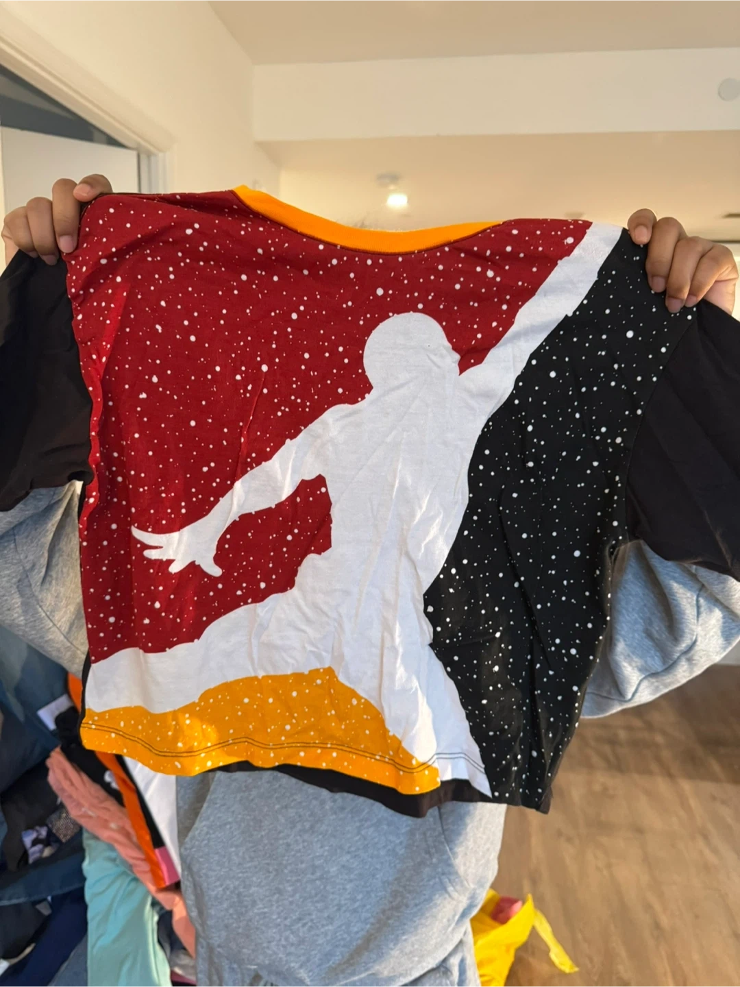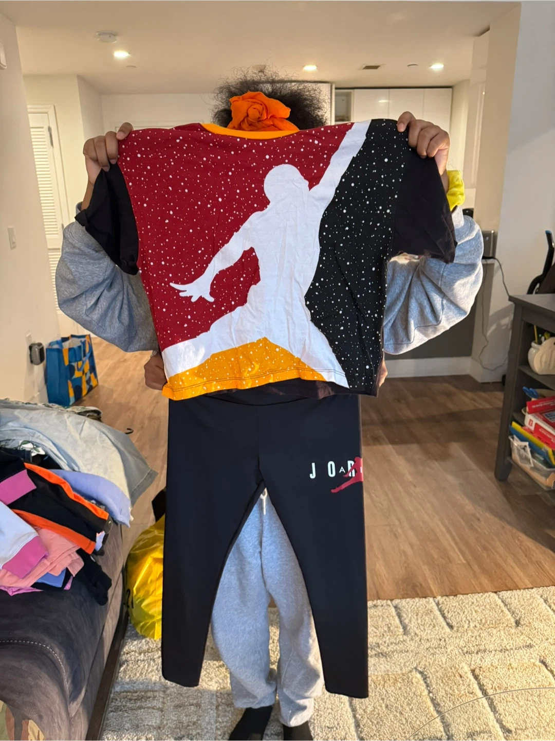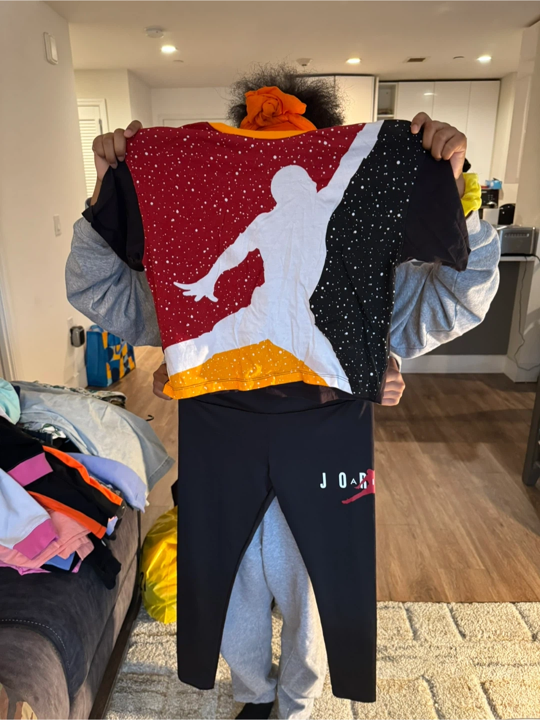 This is a Jordan brand t-shirt and leggings set. The t-shirt features the iconic Jumpman logo with a speckled design. The leggings are black with a Jumpman logo detail.