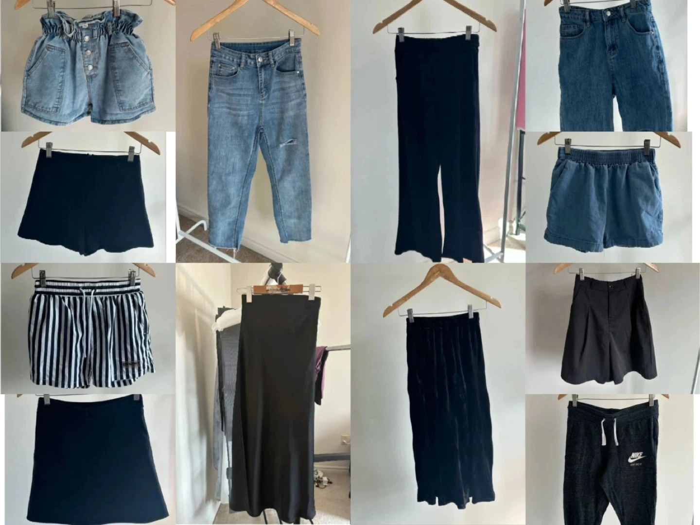 A collection of women's bottoms including denim shorts, black shorts, striped shorts, jeans, black pants, a black skirt, and black joggers. Mostly size medium with some variation. All items are in good condition.