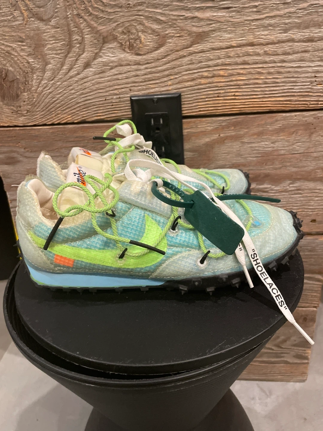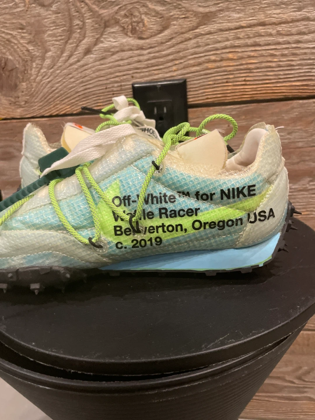 Off-White for Nike Waffle Racer sneakers. Made in c. 2019. These shoes are lightweight and have a unique translucent upper. The "Shoelaces" tag is included.