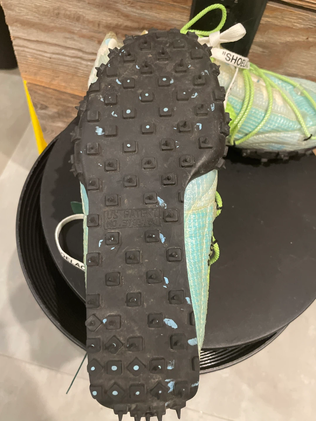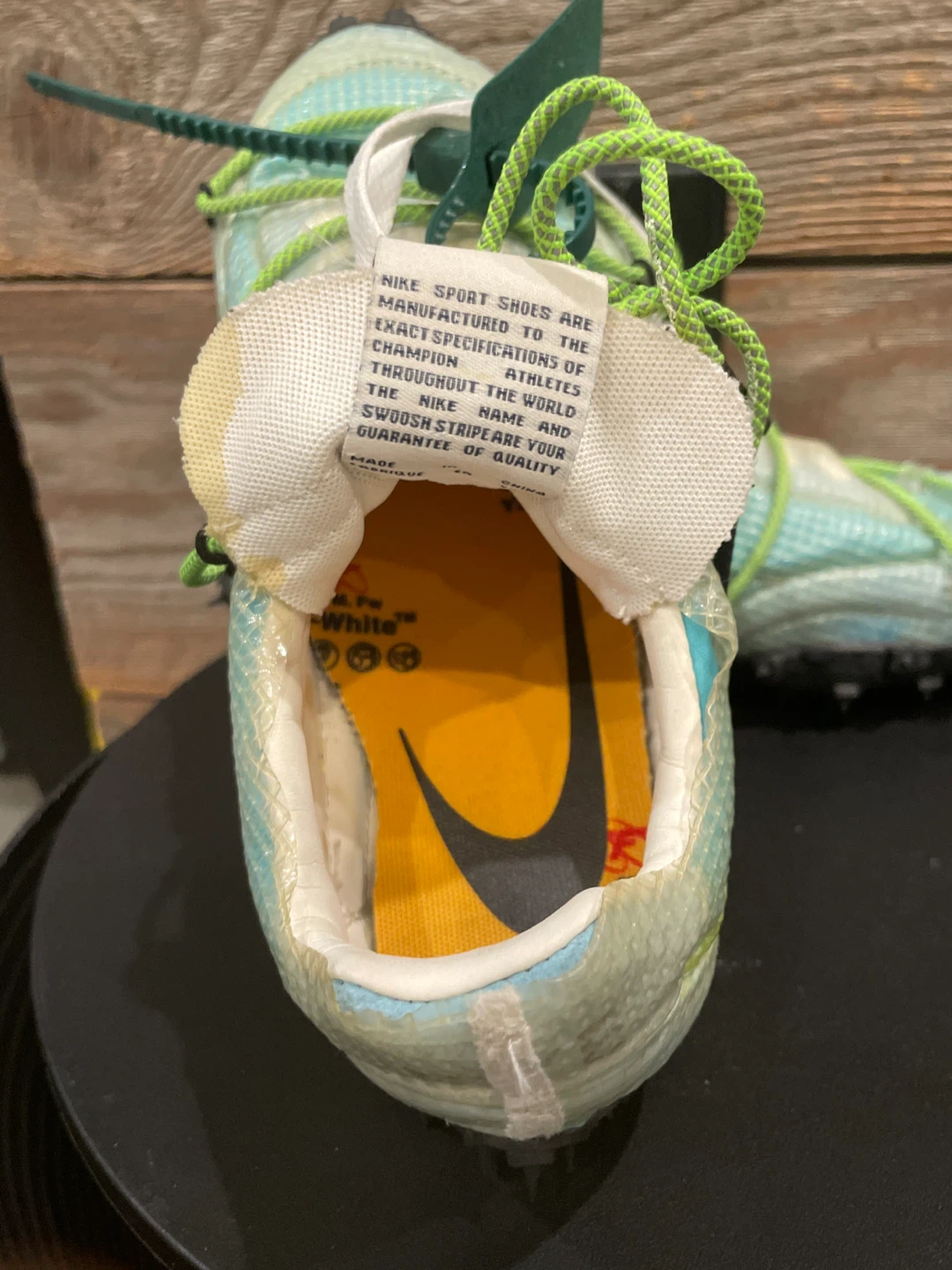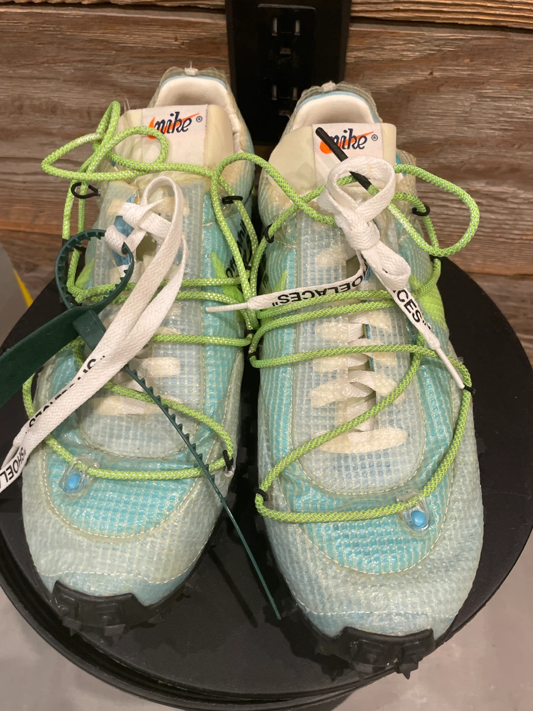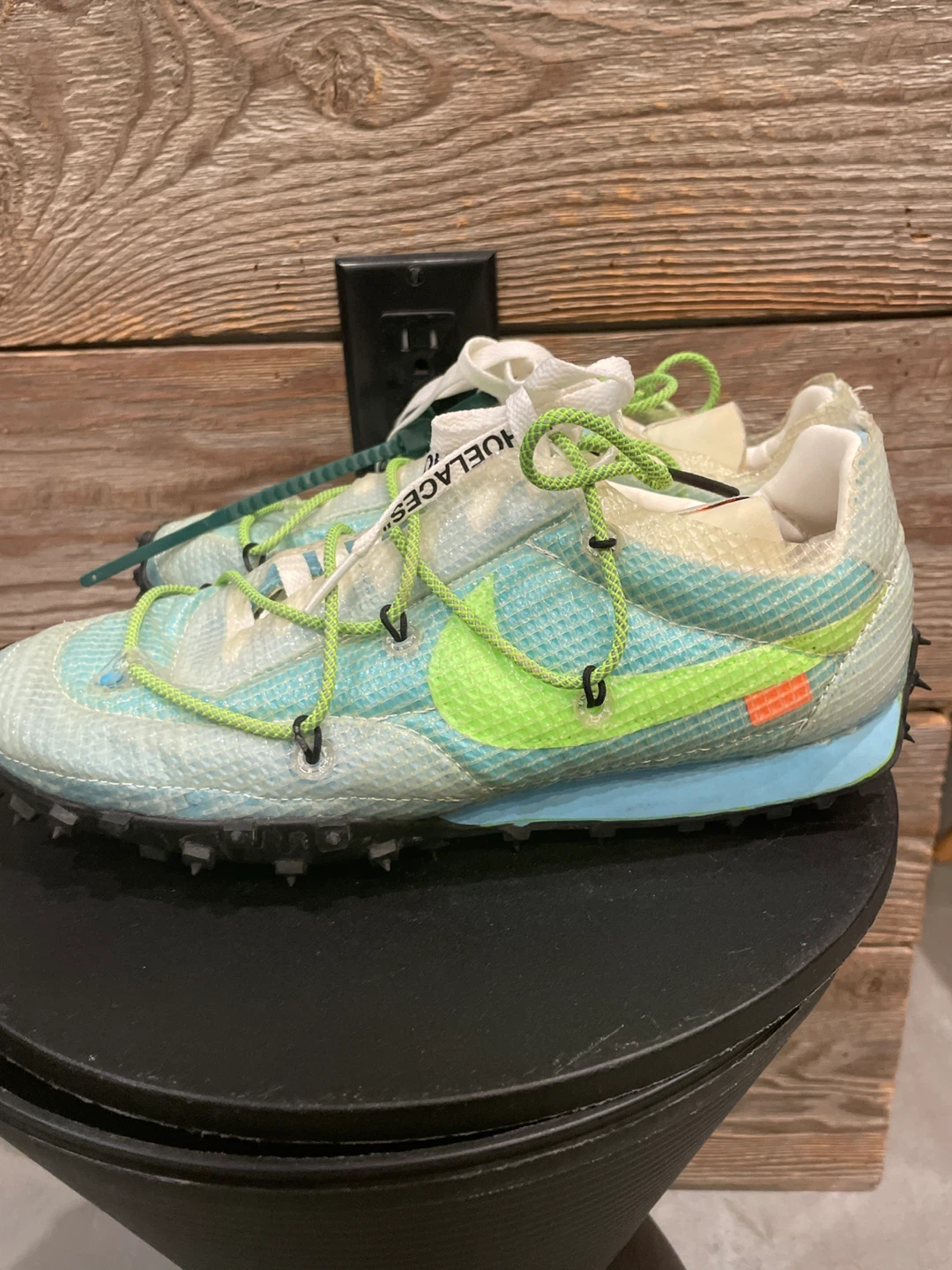 Off-White for Nike Waffle Racer sneakers. Made in c. 2019. These shoes are lightweight and have a unique translucent upper. The "Shoelaces" tag is included.