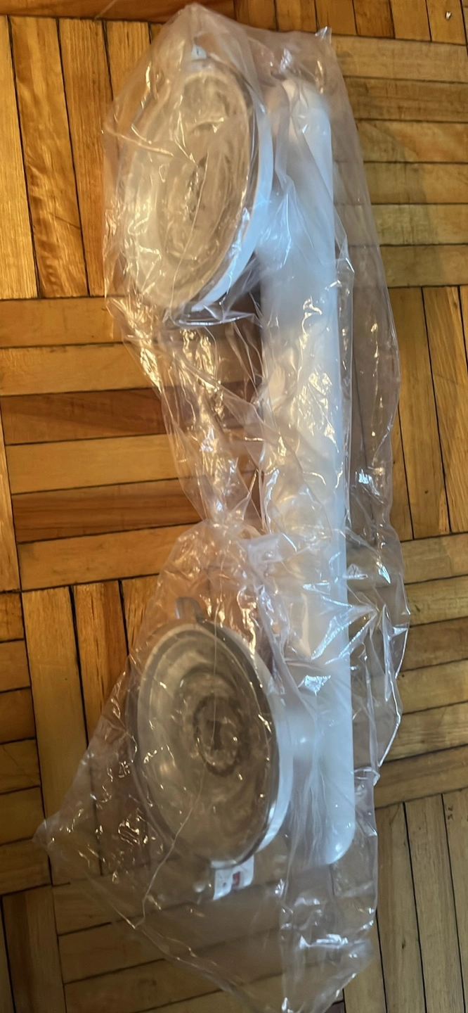 A white safety grab bar for the shower or tub. It has two suction cups. The suction cups appear to be in good condition.