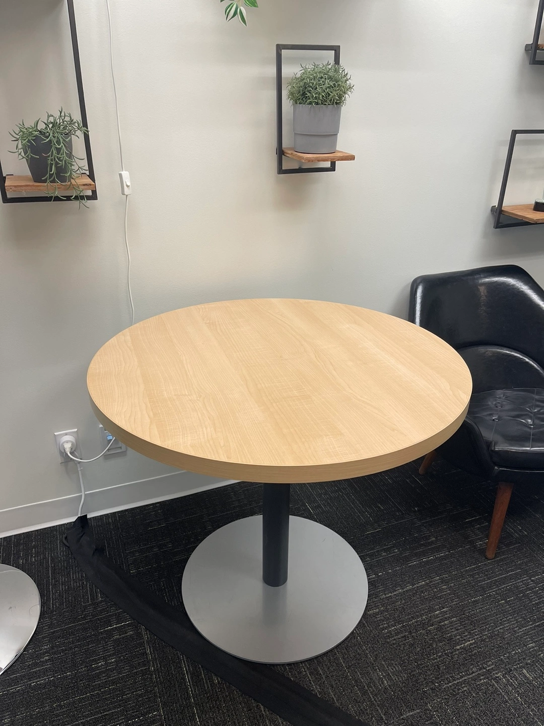 Small round table. Light coloured wood top. Grey metal pedestal base. Perfect for small spaces.