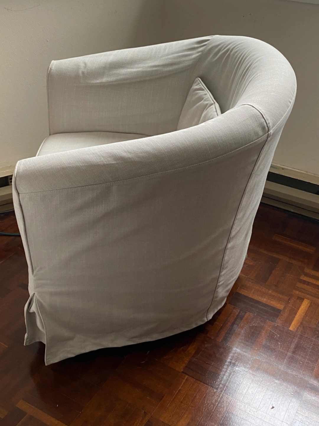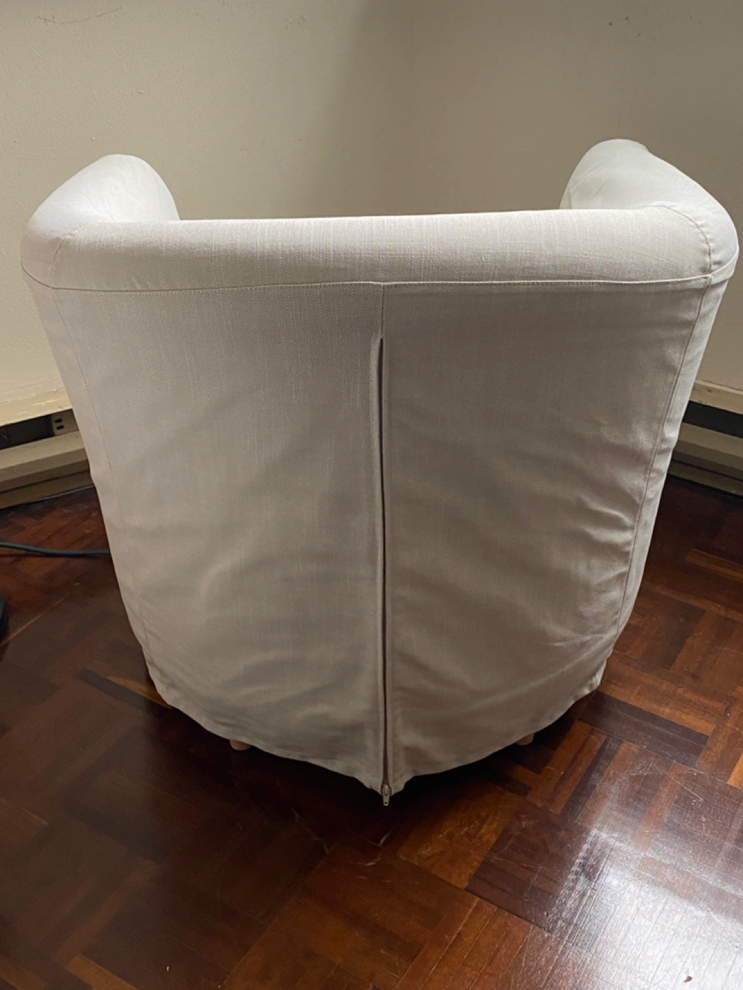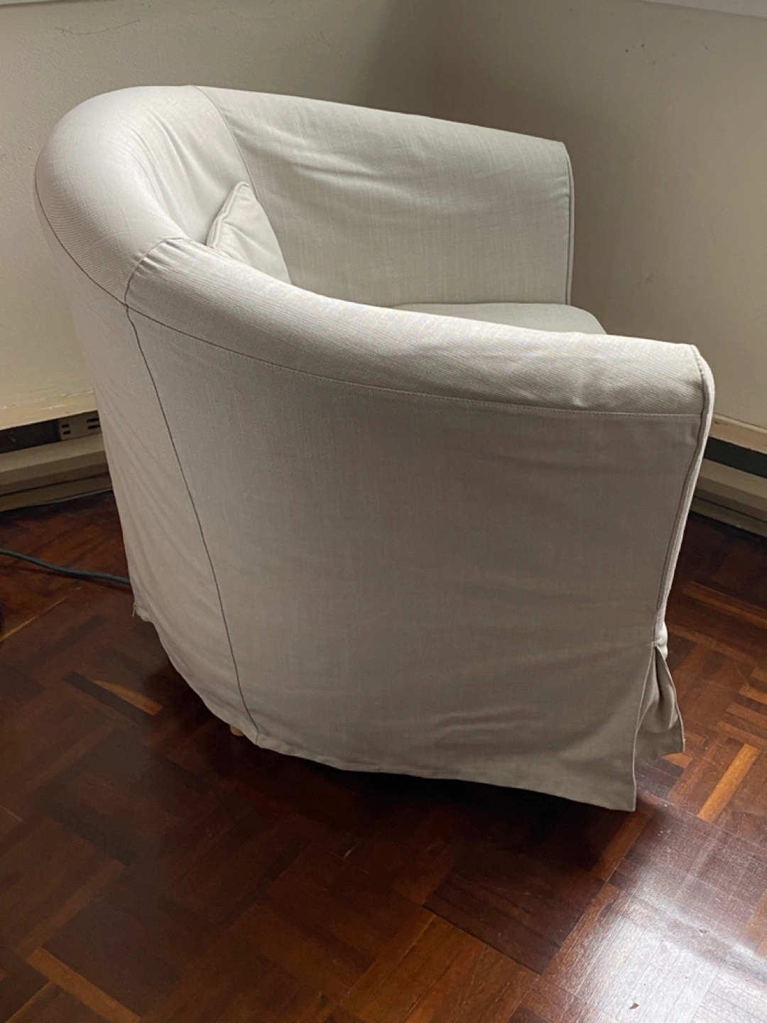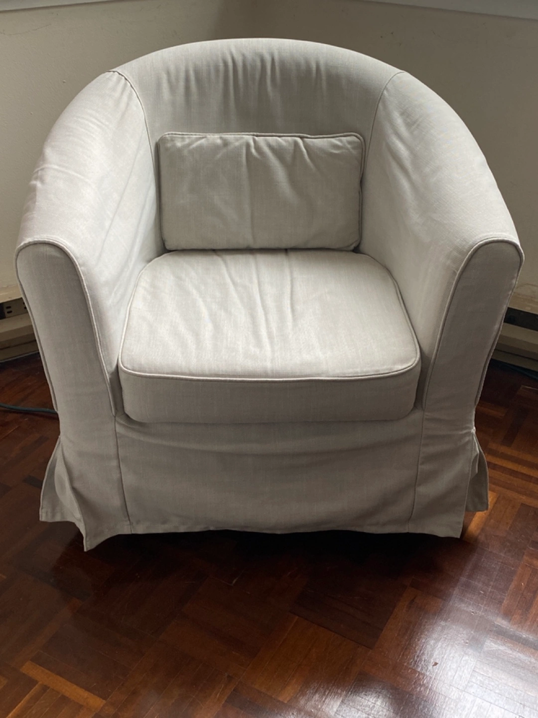 Light-beige (off-white) armchair with a skirt. IKEA TULLSTA. Gently used, bought for $350 a few years ago, always used with additional cover/throw.