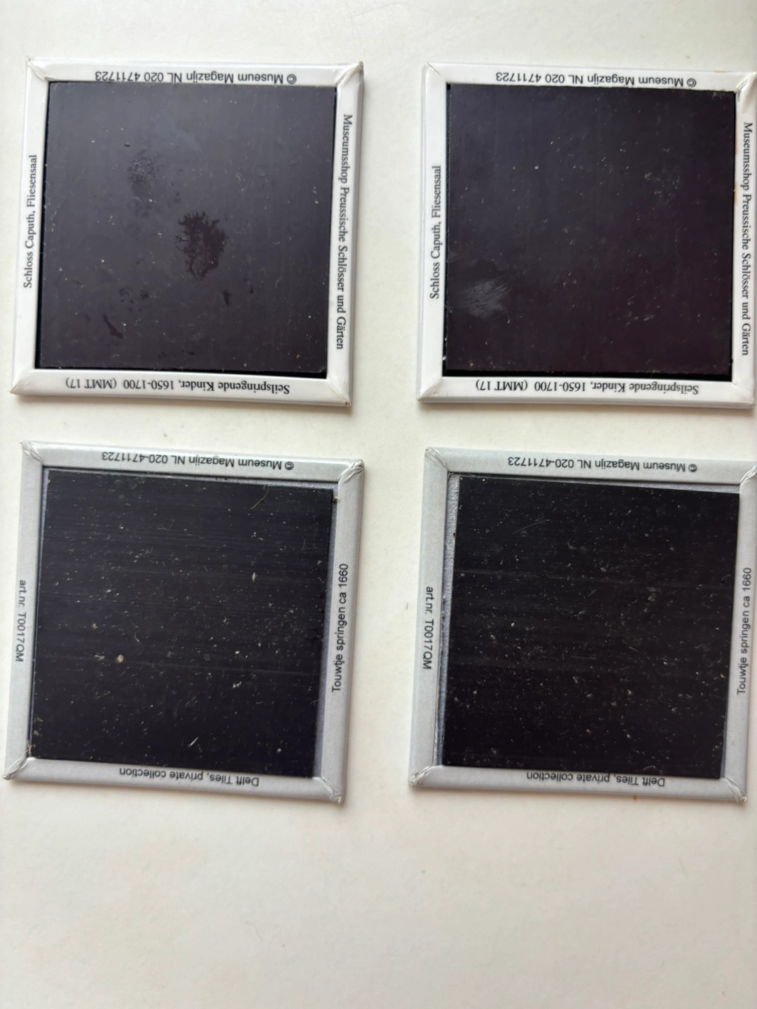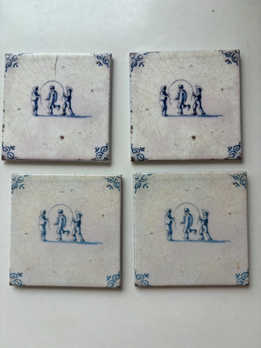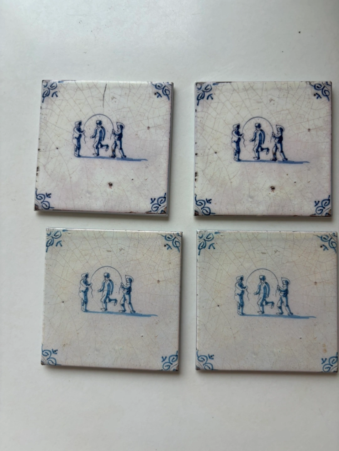 Set of four Delft tiles fridge magnets with children playing, inspired by classic Delft design circa 1550-1700, in blue and white.