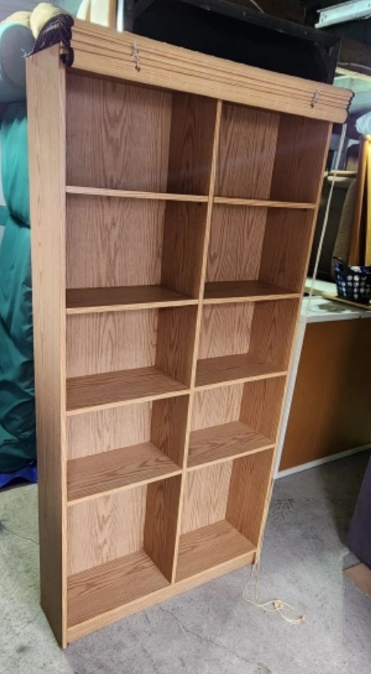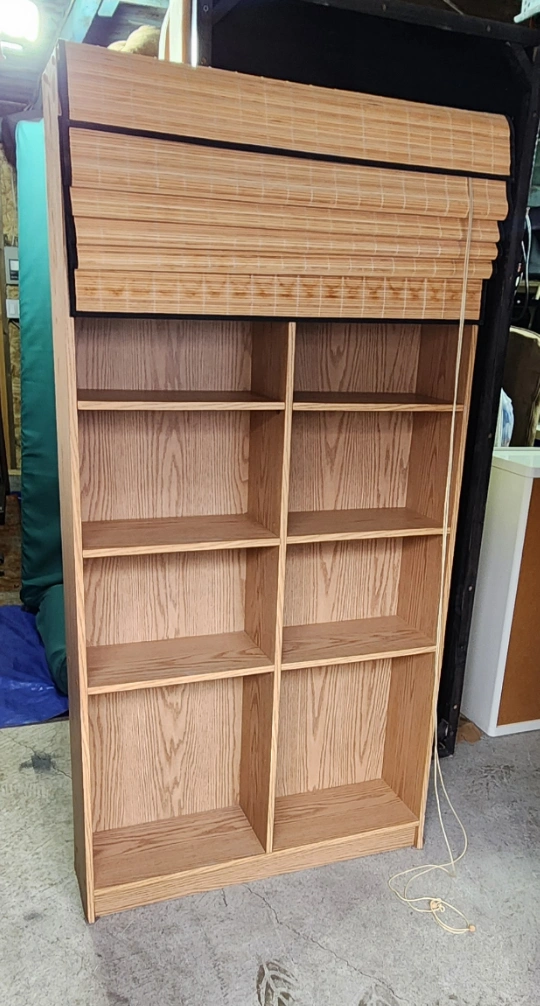 Selling my cool and unique bookshelf. It has been in my familys home for a few years now. It has a Bamboo roll-up blind that can hide the shelves for privacy. I can deliver anywhere and I am selling it for $100 or you can pick it up in East Vancouver