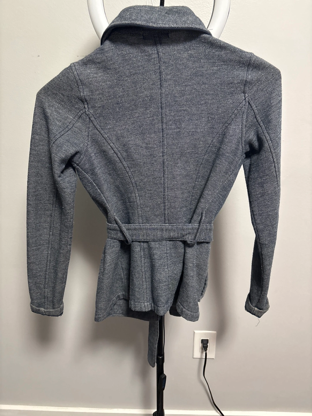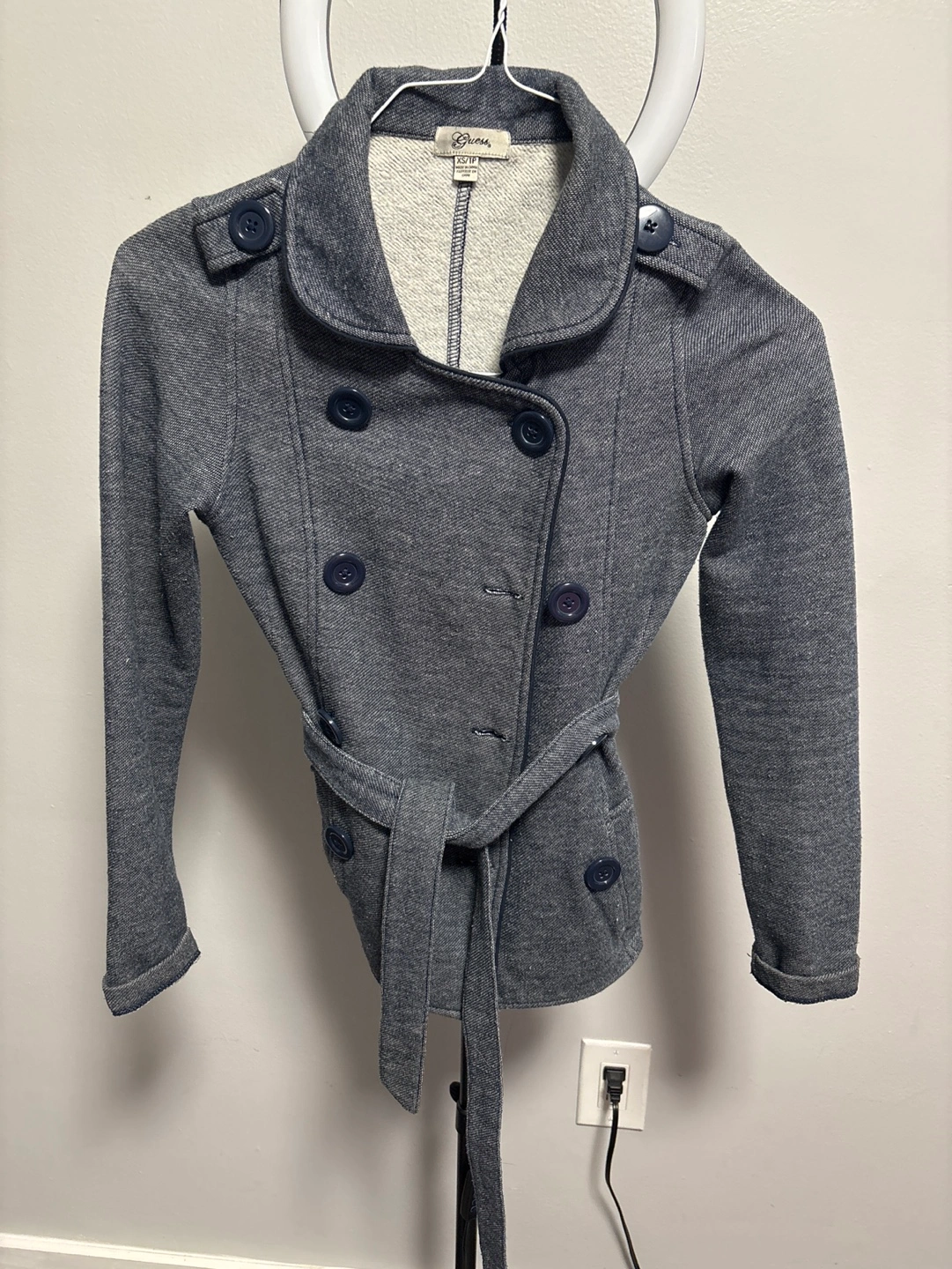 Grey peacoat with a belt. Double-breasted with buttons. Long sleeves.